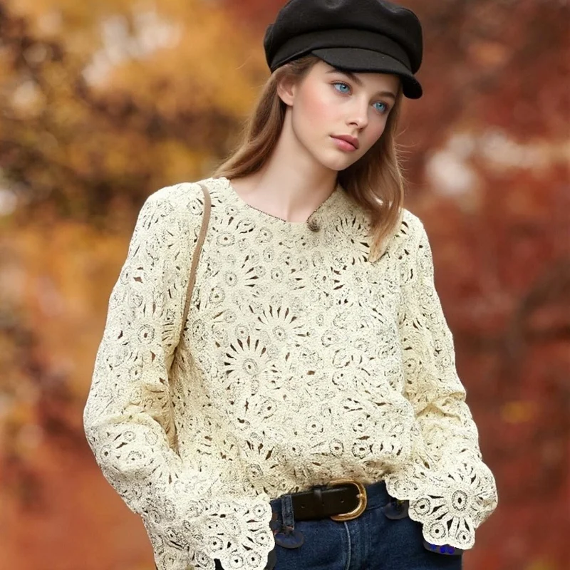 Autumn New High-End Design Loose Elegant Korean Acrylic Anti-Pilling Solid O-Neck Pullover Knitted Sweater for Women