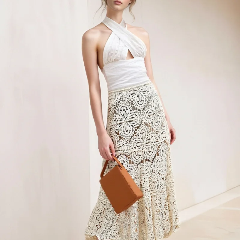 Forest Style Retro Literary Loose Fit Heavy Craft Solid Hem High Waist 100% Cotton Soft Knitted Midi Girl Skirt