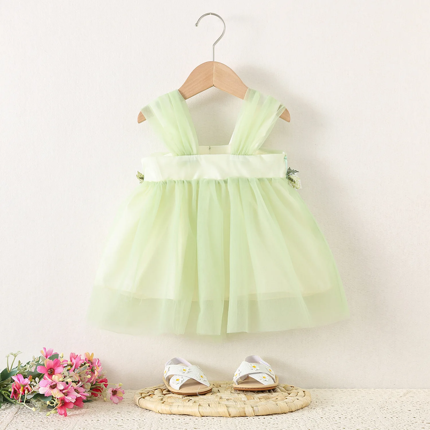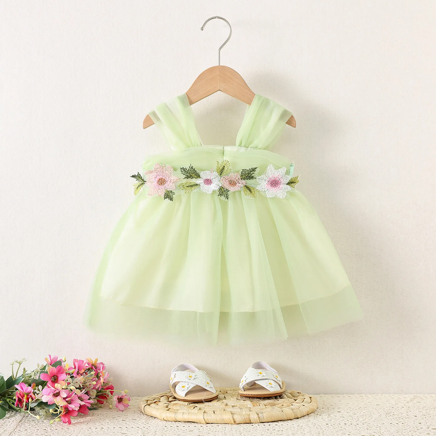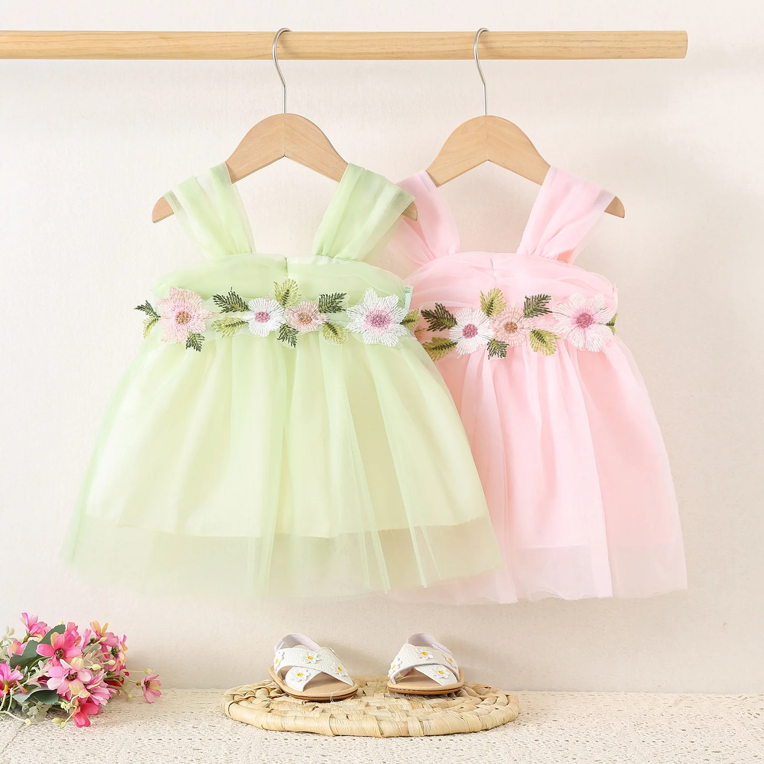 Summer Elegant Princess Floral Organza Strap Waist with Sweet Ruffles Knee-Length ODM Dresses for Girls