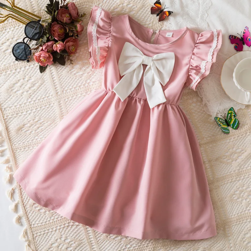 Summer New Cute Bow A-line Regular Sleeves Printed Solid Lace Eco-friendly ODM Knee-Length Dresses for Girls