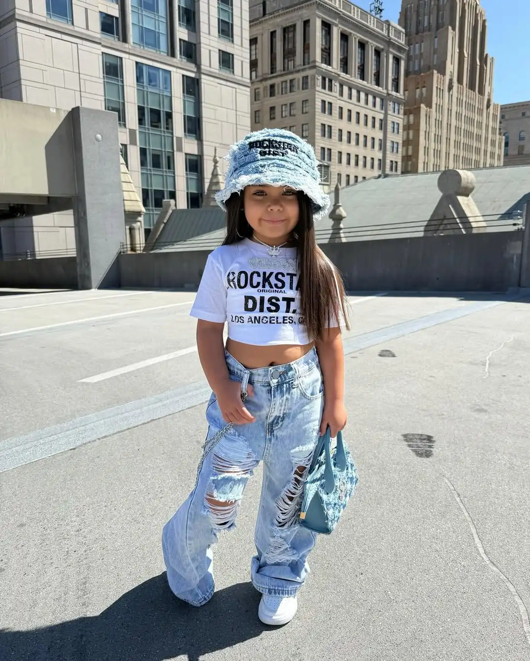 New Design Casual Streetwear Pullover T-Shirt Printed Letters Organic Cotton Light Blue Distressed Ripped Jeans Pant Kids