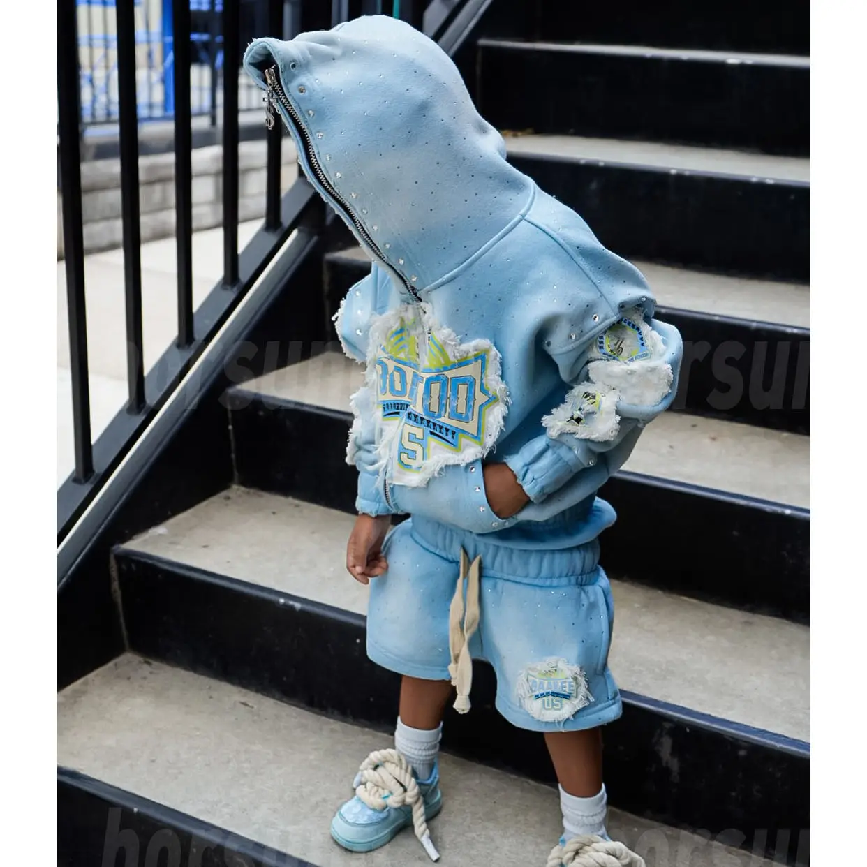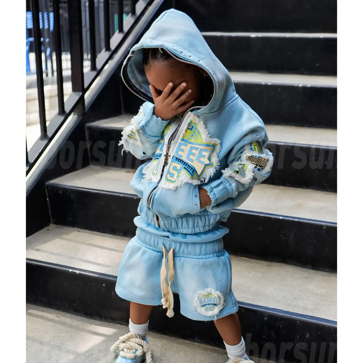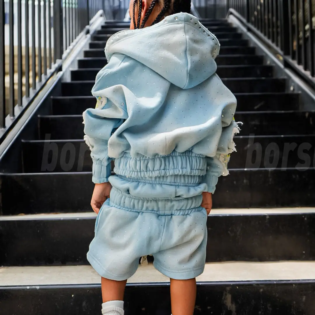 Custom Kids Vintage Washed Sewatpants Shorts and Hoodie Set Rhinestone Distressed Embroidery Two Piece Sets Sweatsuits Set