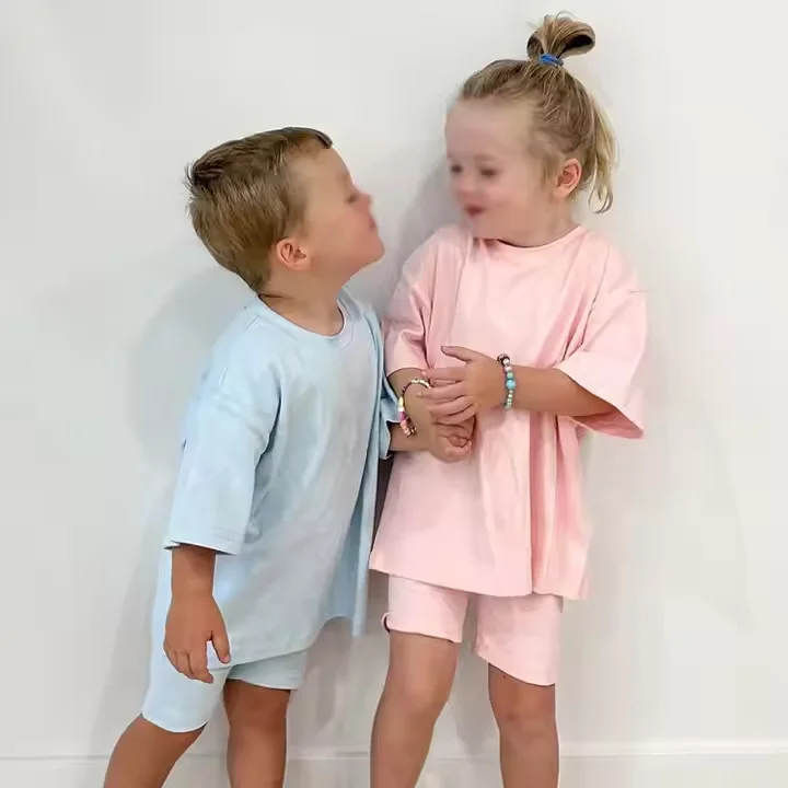Wholesale Custom Cotton Spandex Casual Print Knit Short Sleeve Drop Shoulder Oversized T-Shirt and Shorts Set for Toddler Unisex