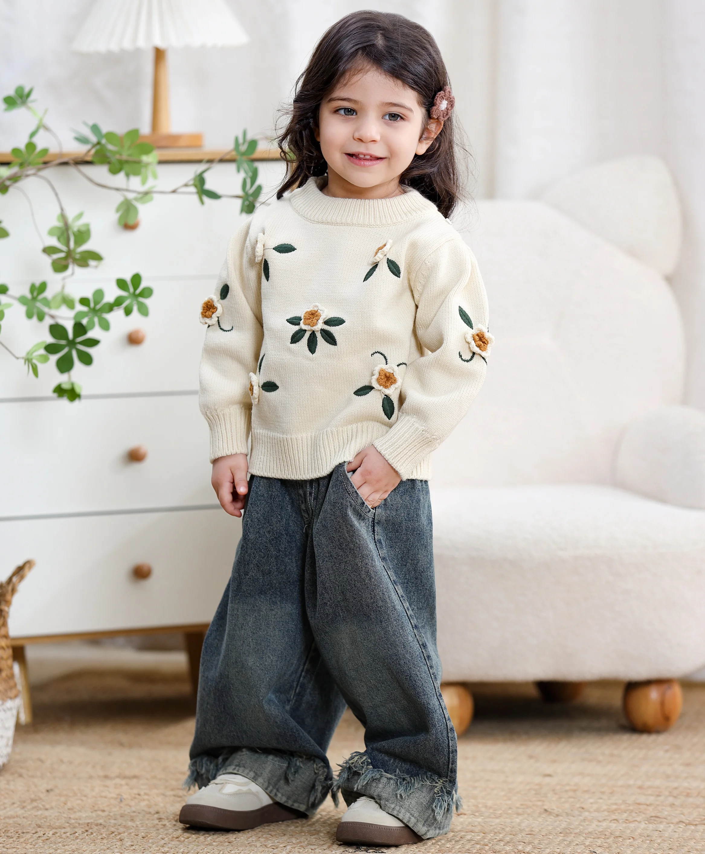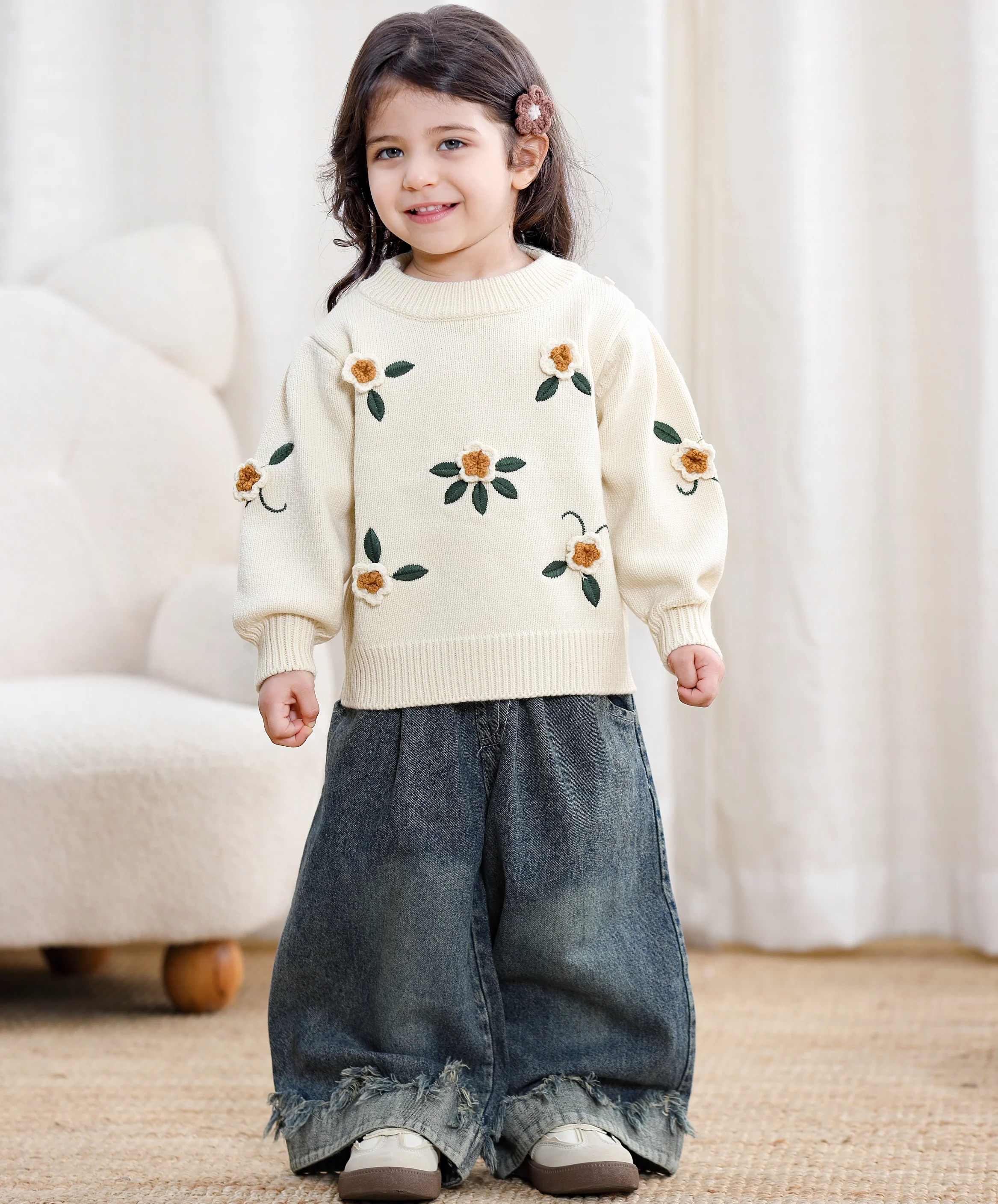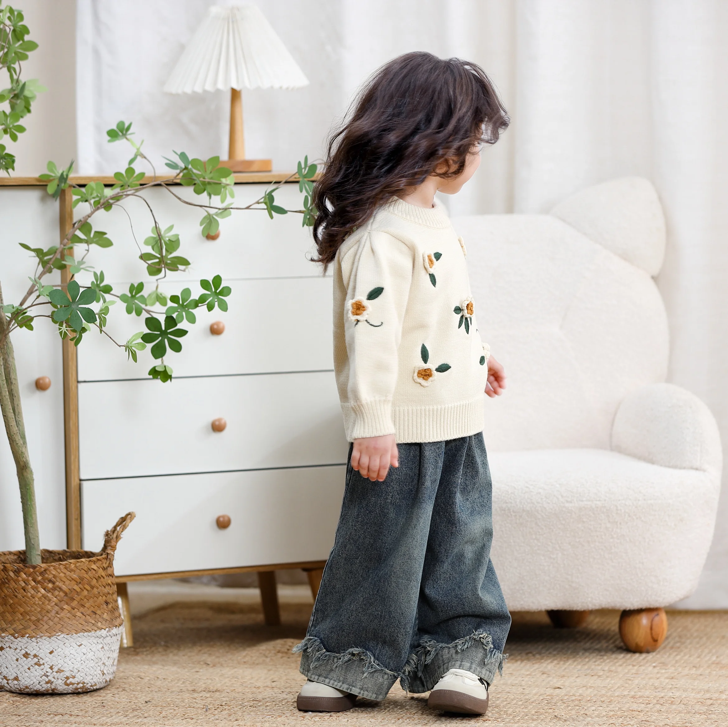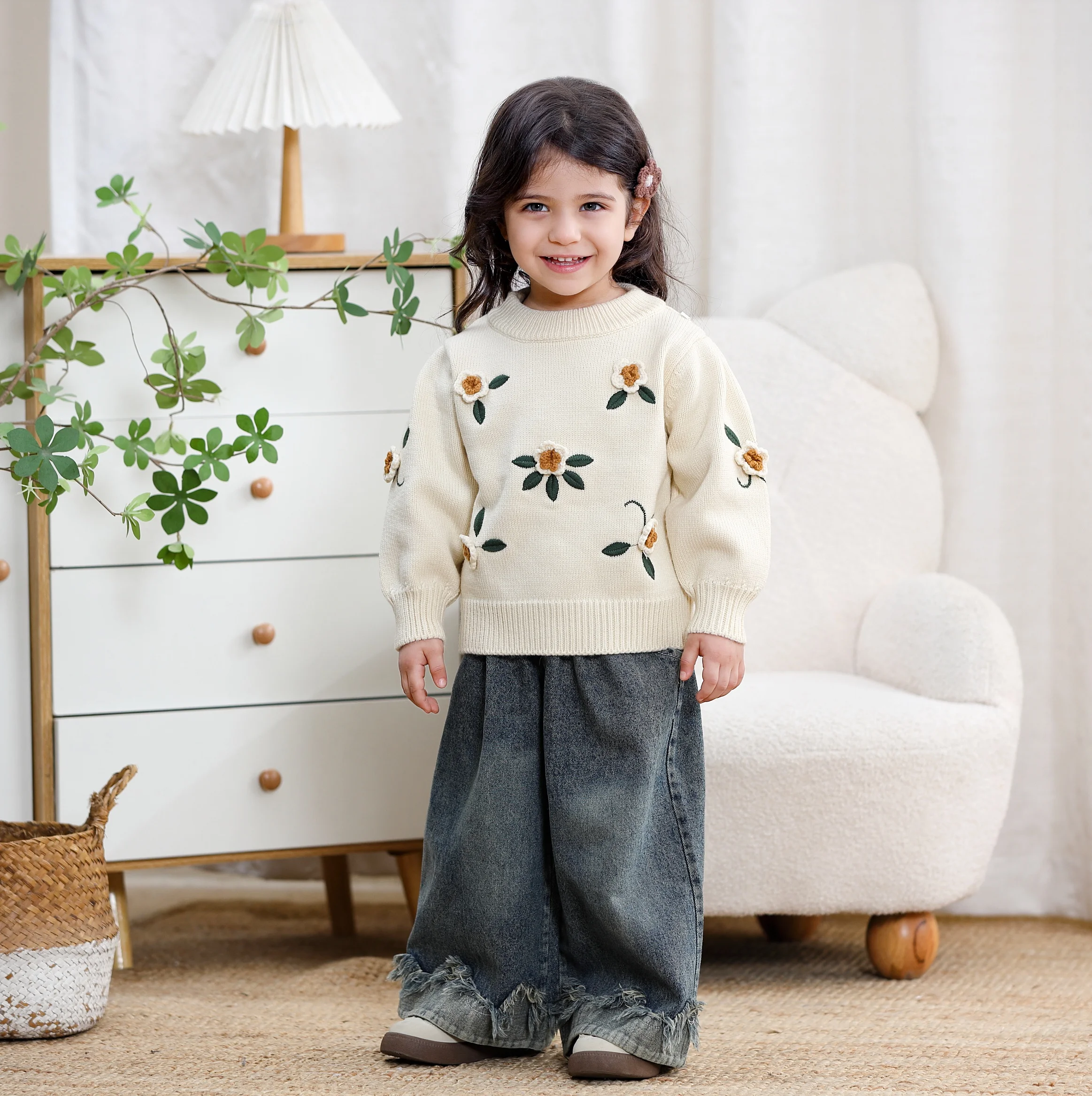 Autumn 2026 Baby Girl Pullover Knitted Baby Girl Sweet Sweater Top Handmade with Beautiful Flower Embroidery Baby Tops