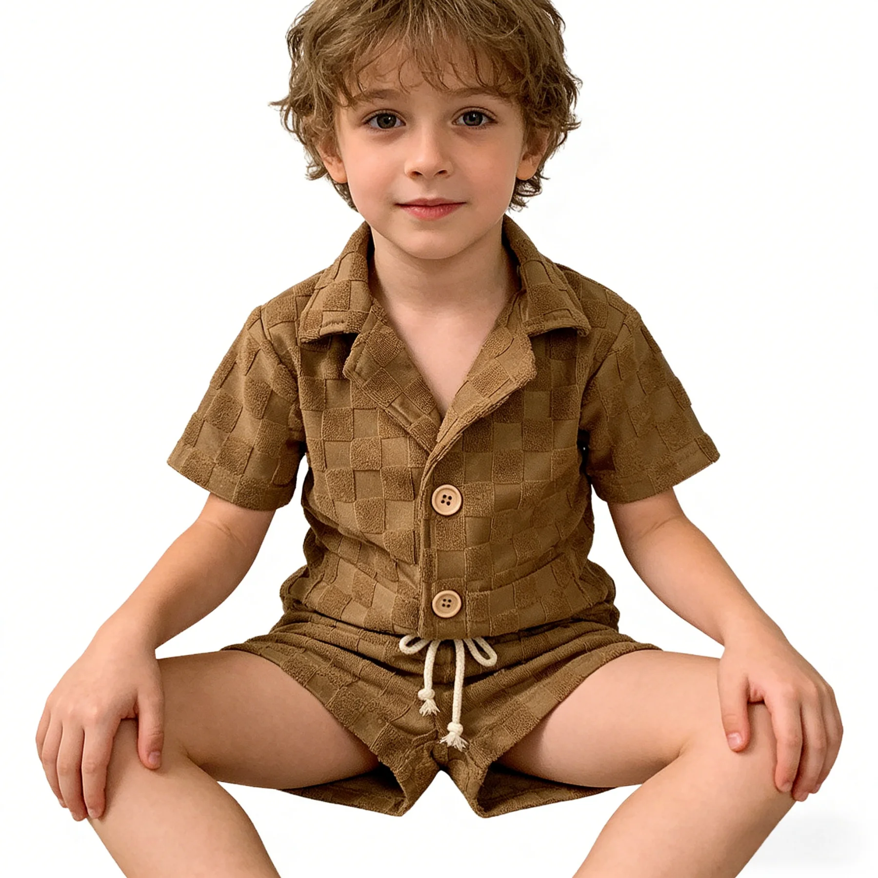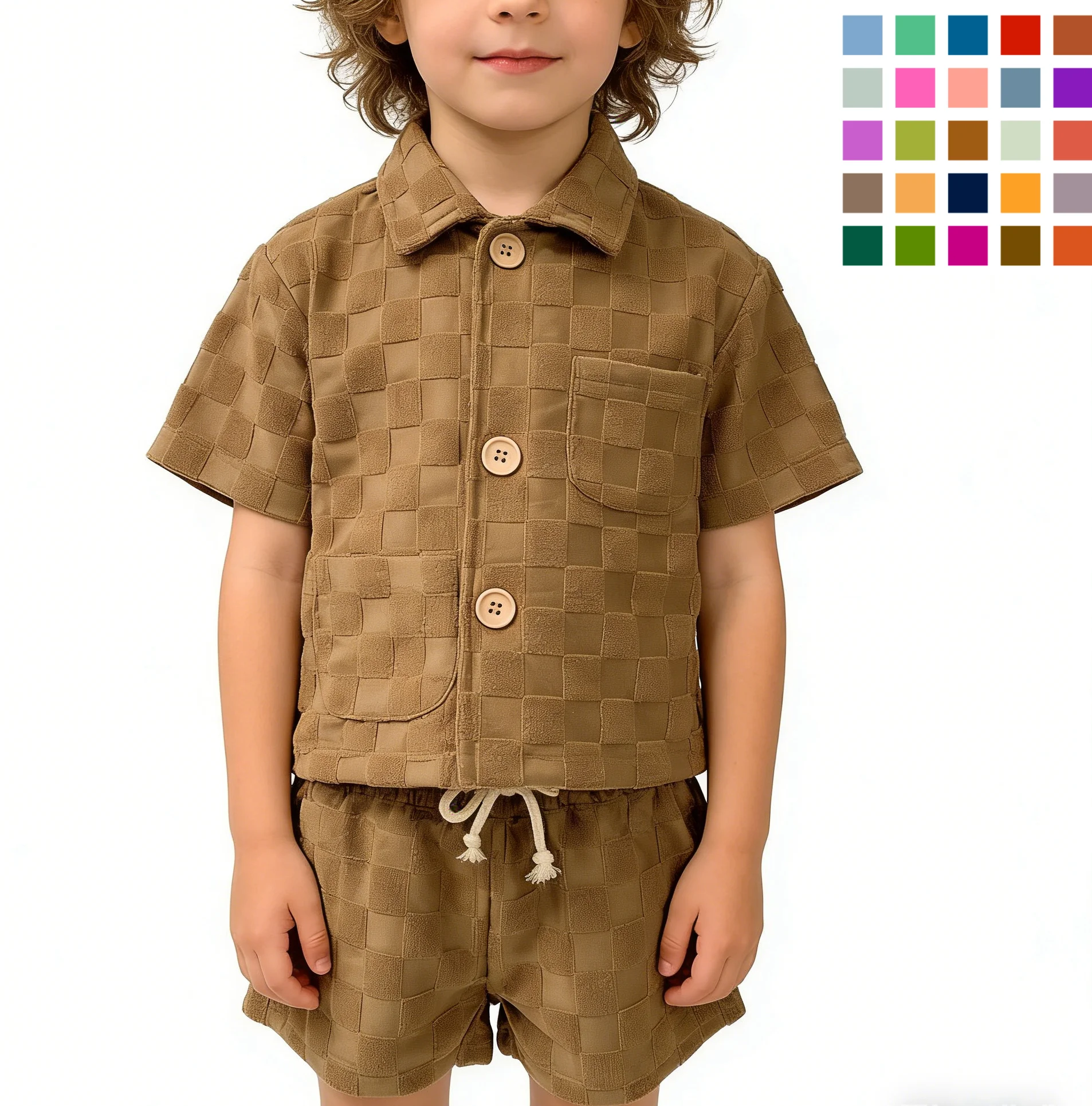 Wholesales Summer Kids Two Pieces Checkered Towelling Terry Button up Shirt Shorts Baby Jacquard Kids Clothing Set