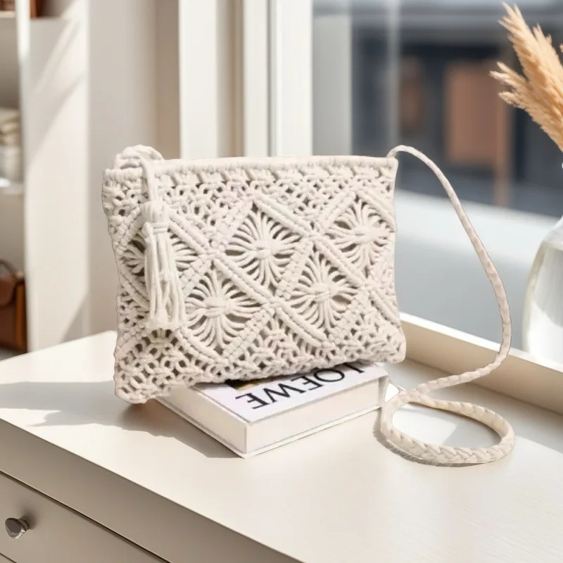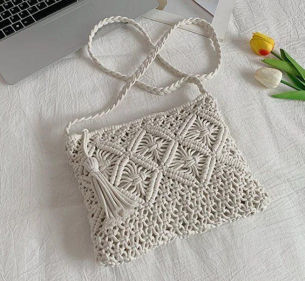 New Simple Tassel Hand Woven Bag Vintage Cotton Macrame Wallet Purse Shoulder Bag Handmade Woven Tassel Cross-body Bag