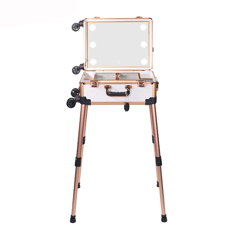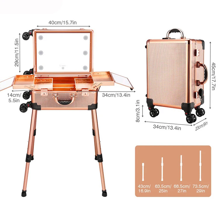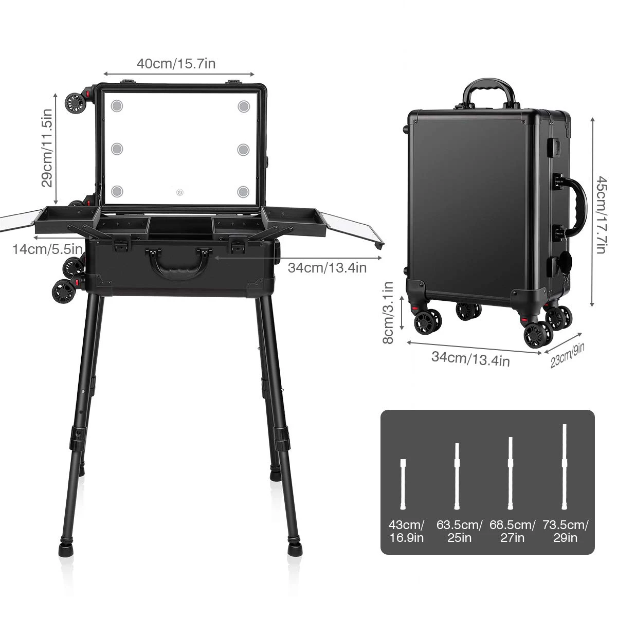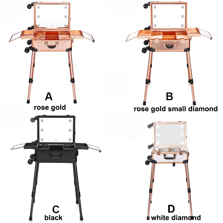 Aluminum 4 Wheels Professional Rolling Cosmetic Makeup Suitcase Train Case With Lighted Mirror LED Light