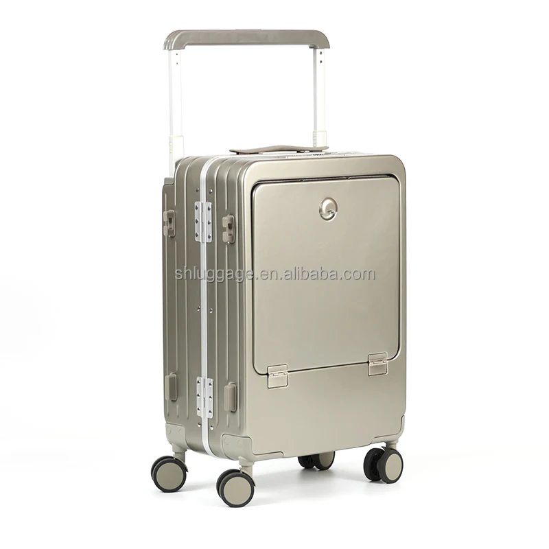 PC Wide Front Open Trolley Suitcase Lightweight Aluminum Travel Bags with Water Cup Holder Fabric Luggage Waterproof Features