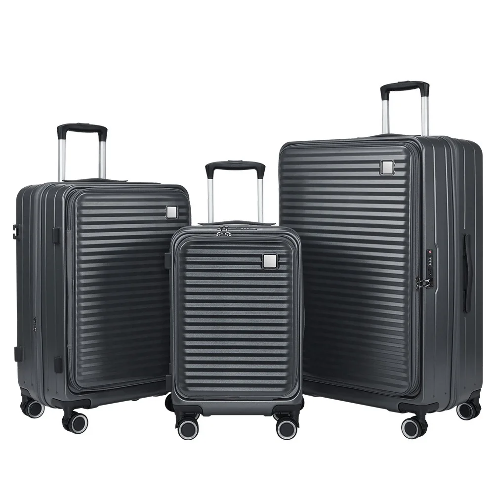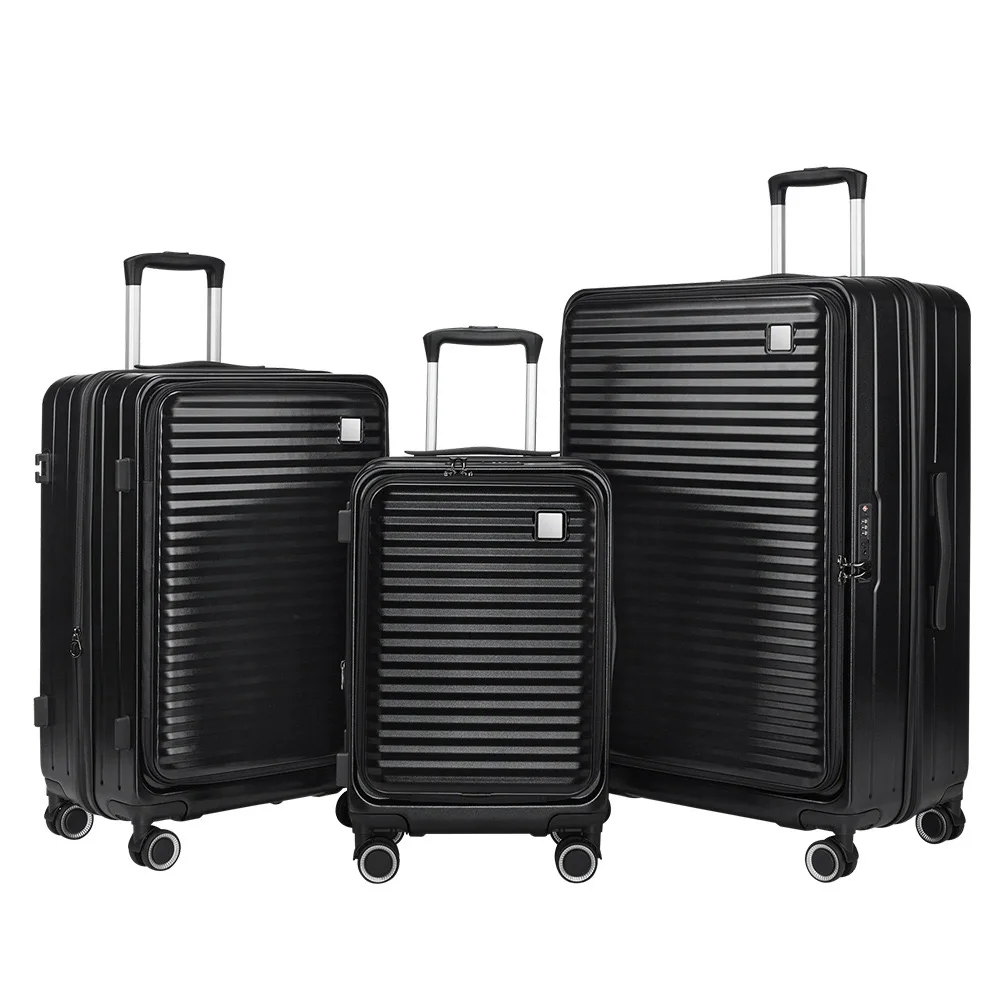 Wholesale Black 3 Piece Trolley Luggage Set 20 24 28 Inch 4 Wheels Large Size Front Open Suitcase Luggage
