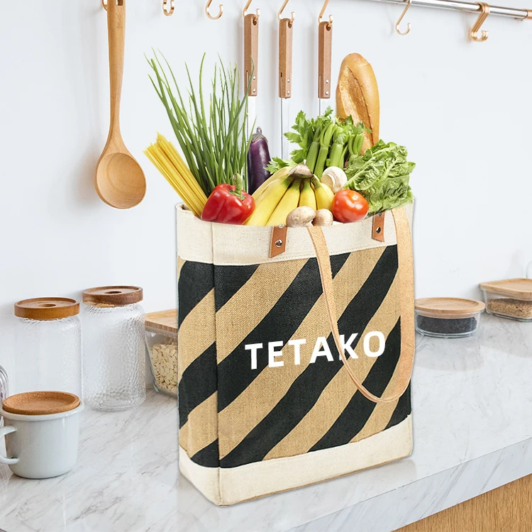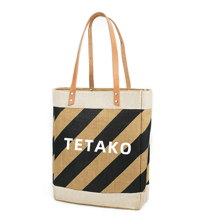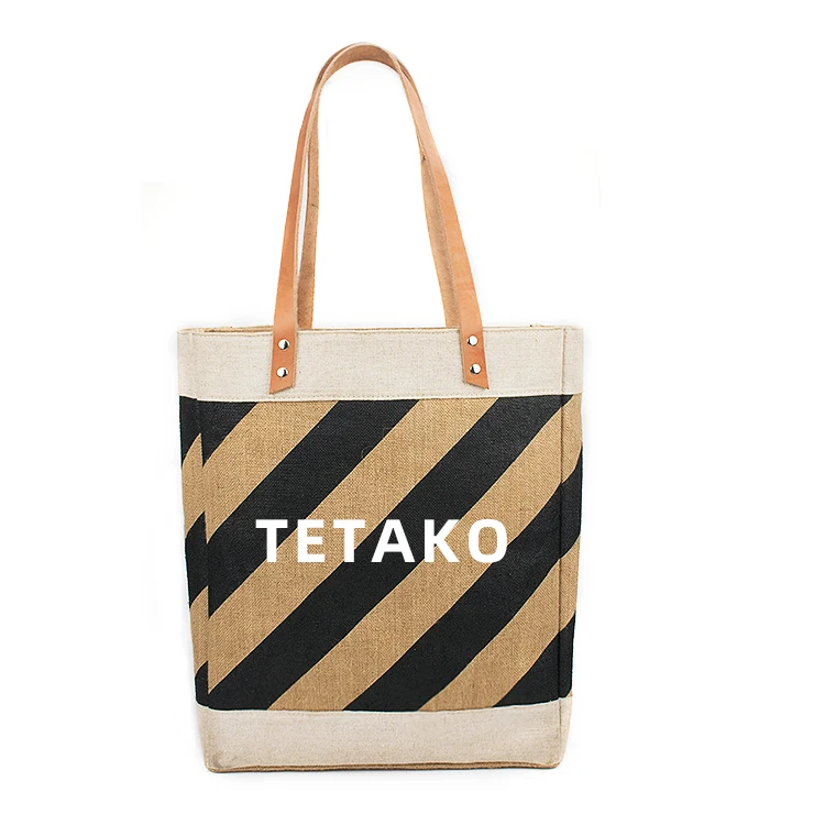 Custom Waterproof Lining Portable Reusable Large Capacity Shopping Lightweight Eco-Friendly Jute Tote Bag with Leather Handles