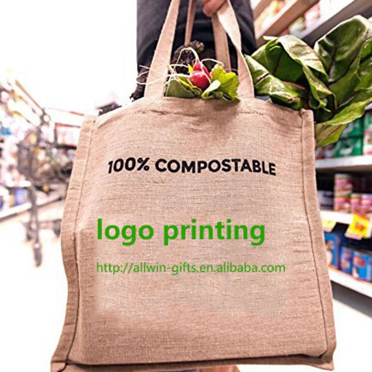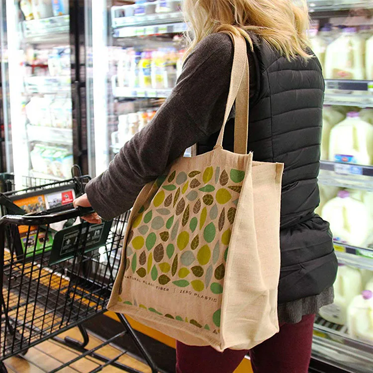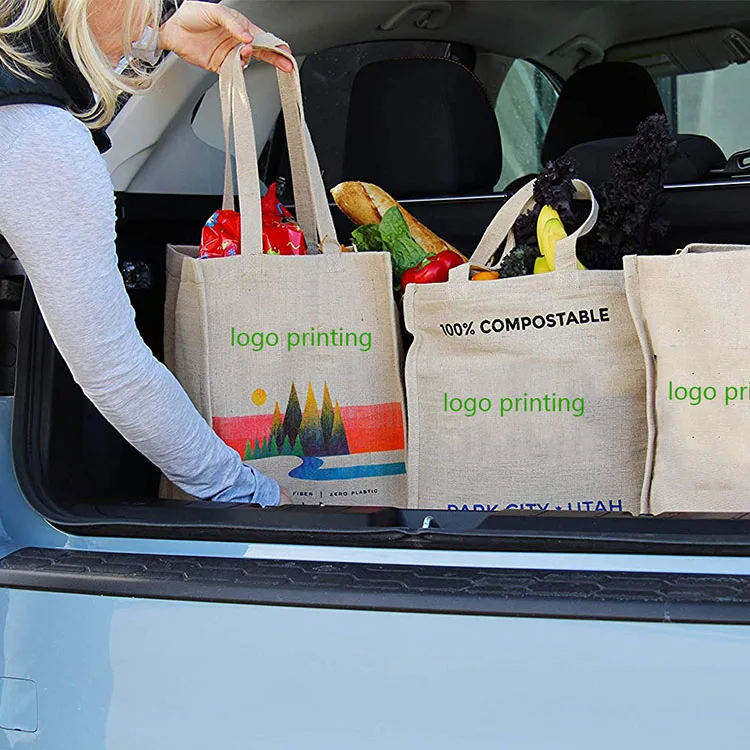 Custom Logo Printed Large Capacity Jute Bag Eco Friendly Foldable Shopping Tote Hemp Grocery Bag