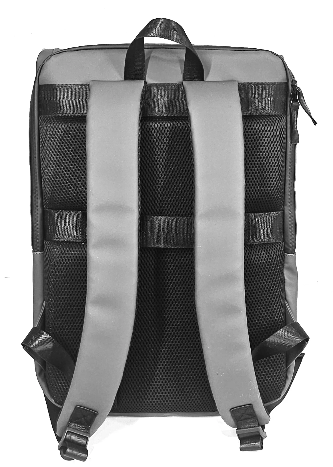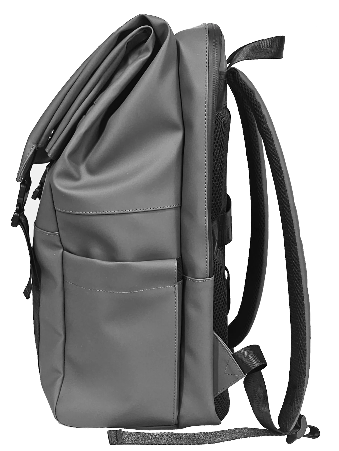 Gray Vinyl Backpack, 2-Buckle Opening, Multi-Pockets (Laptop Compartment + Side Pockets) with Luggage Strap