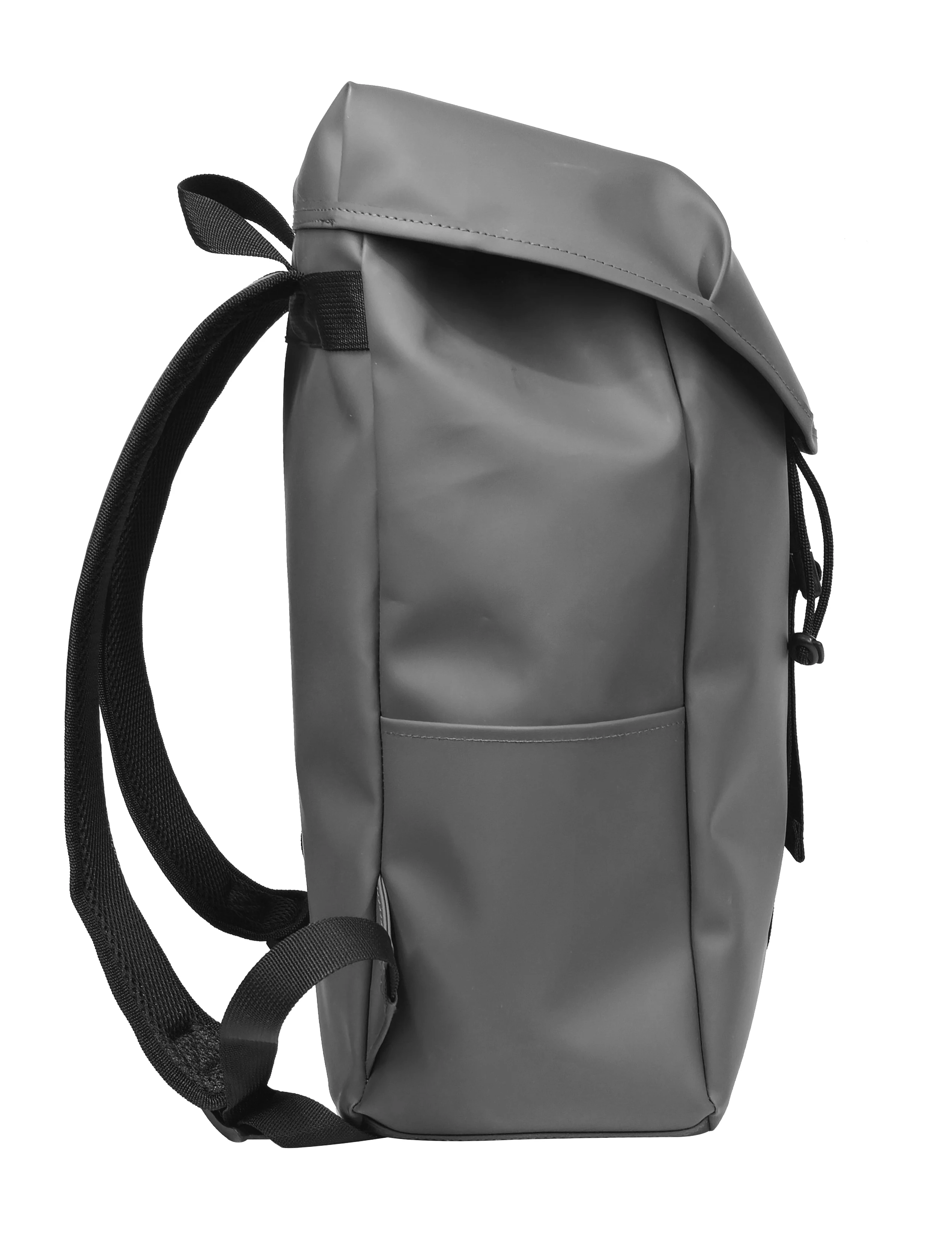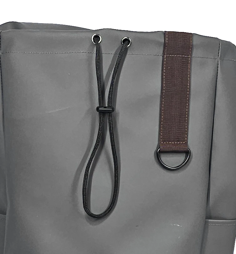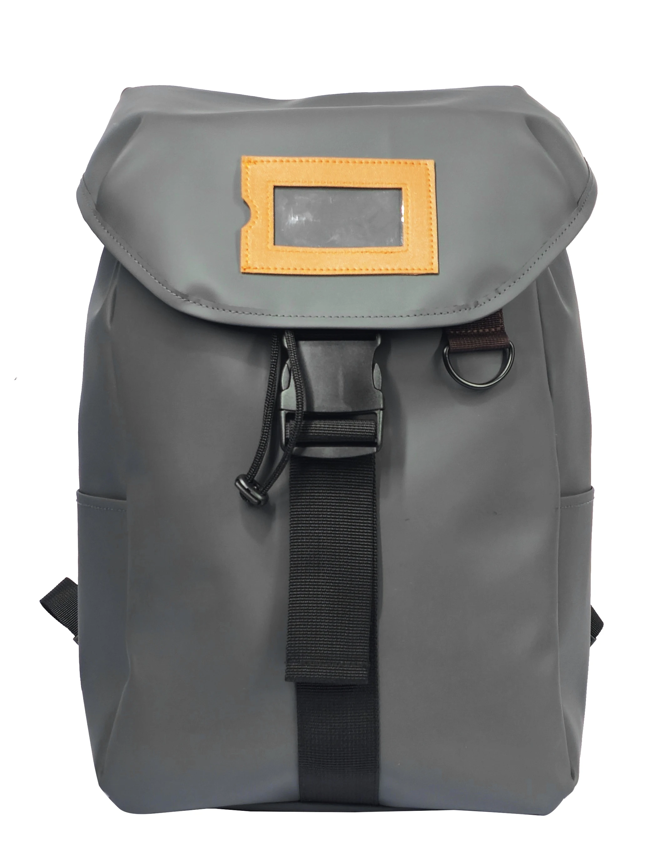 Gray Vinyl Backpack, Drawstring & Buckle Closure, Name Card Pocket & Laptop Compartment