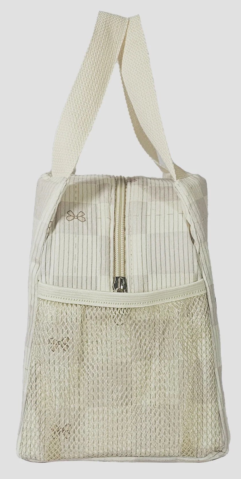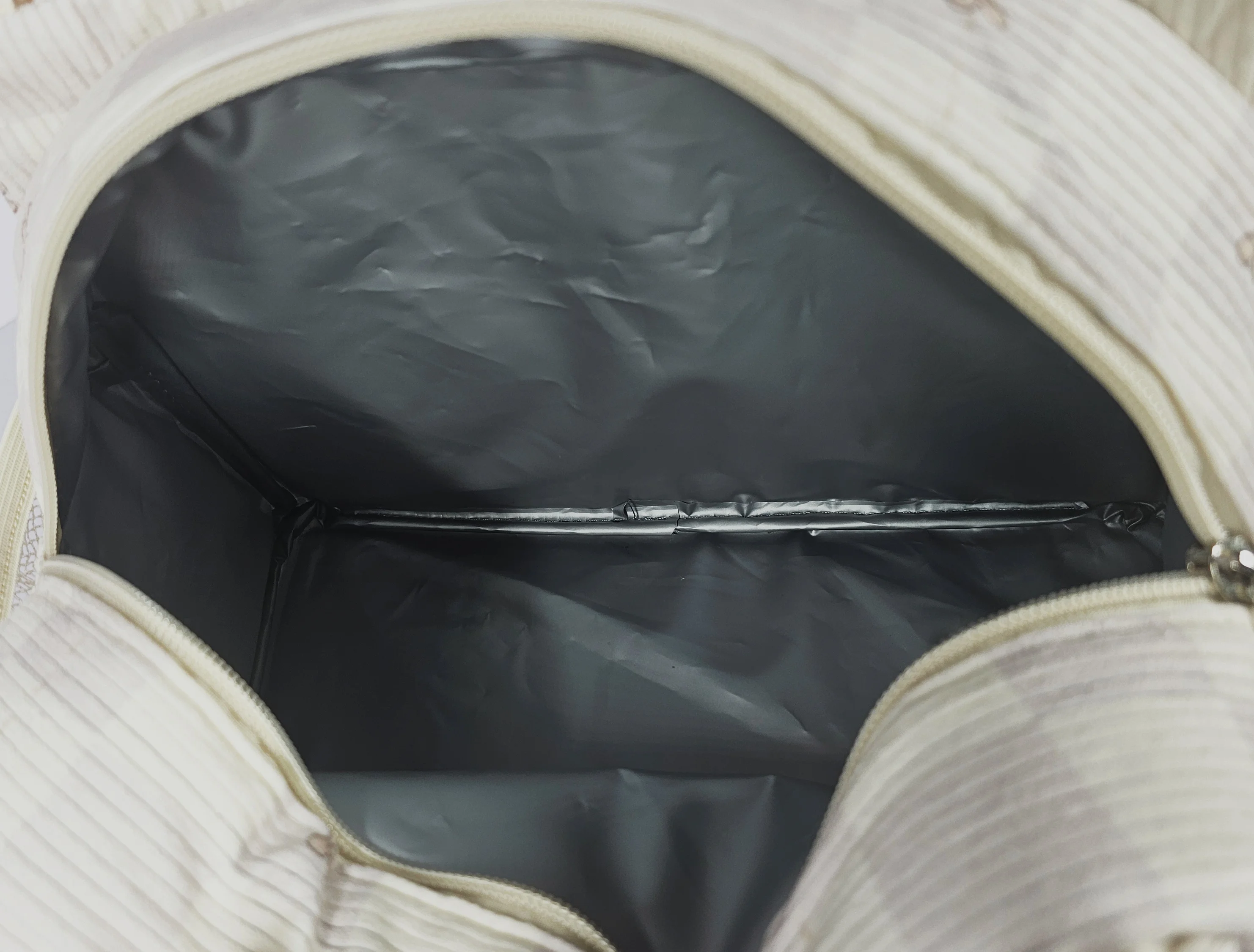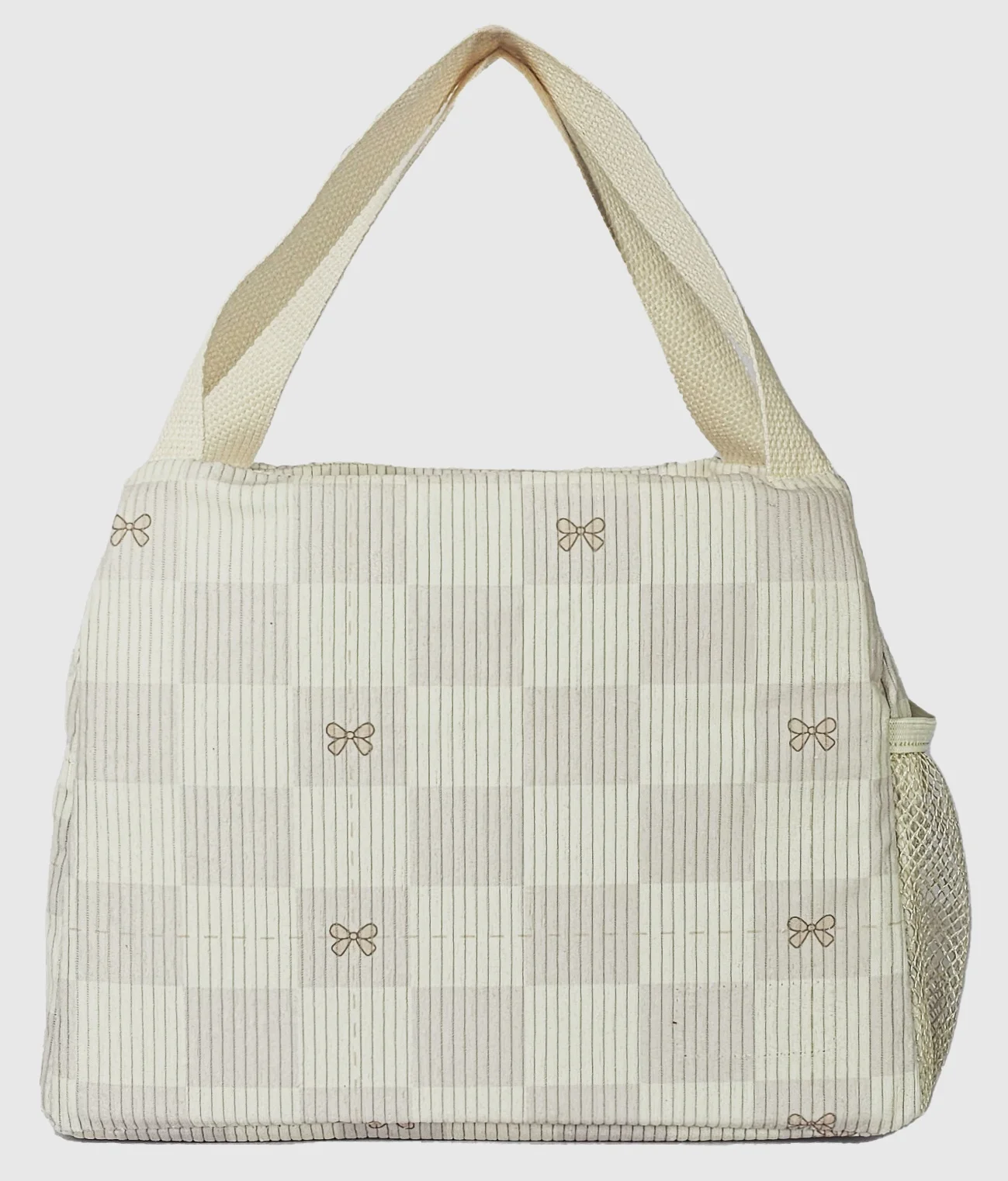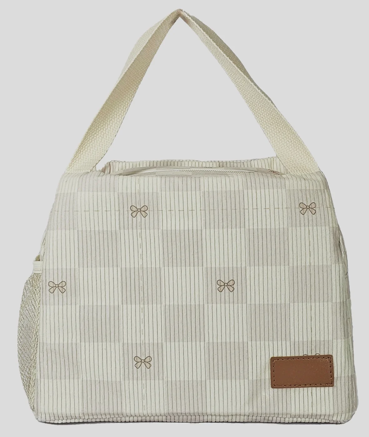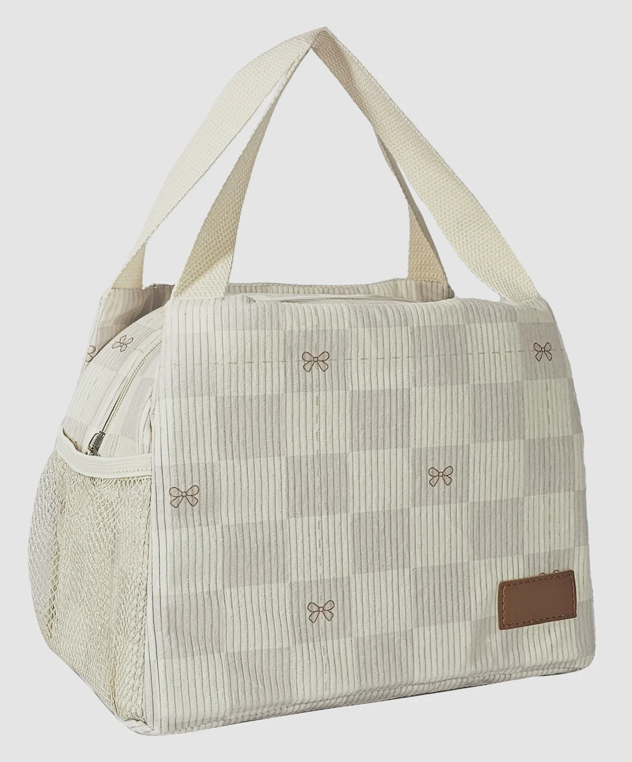 Corduroy Insulated Lunch Bag with PEVA Lining, Stylish Thermal Tote with Bow Pattern & Mesh Pocket for Picnic/Work