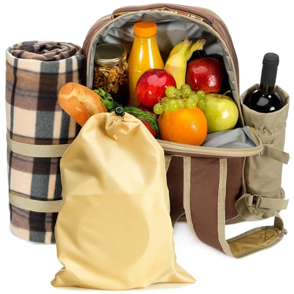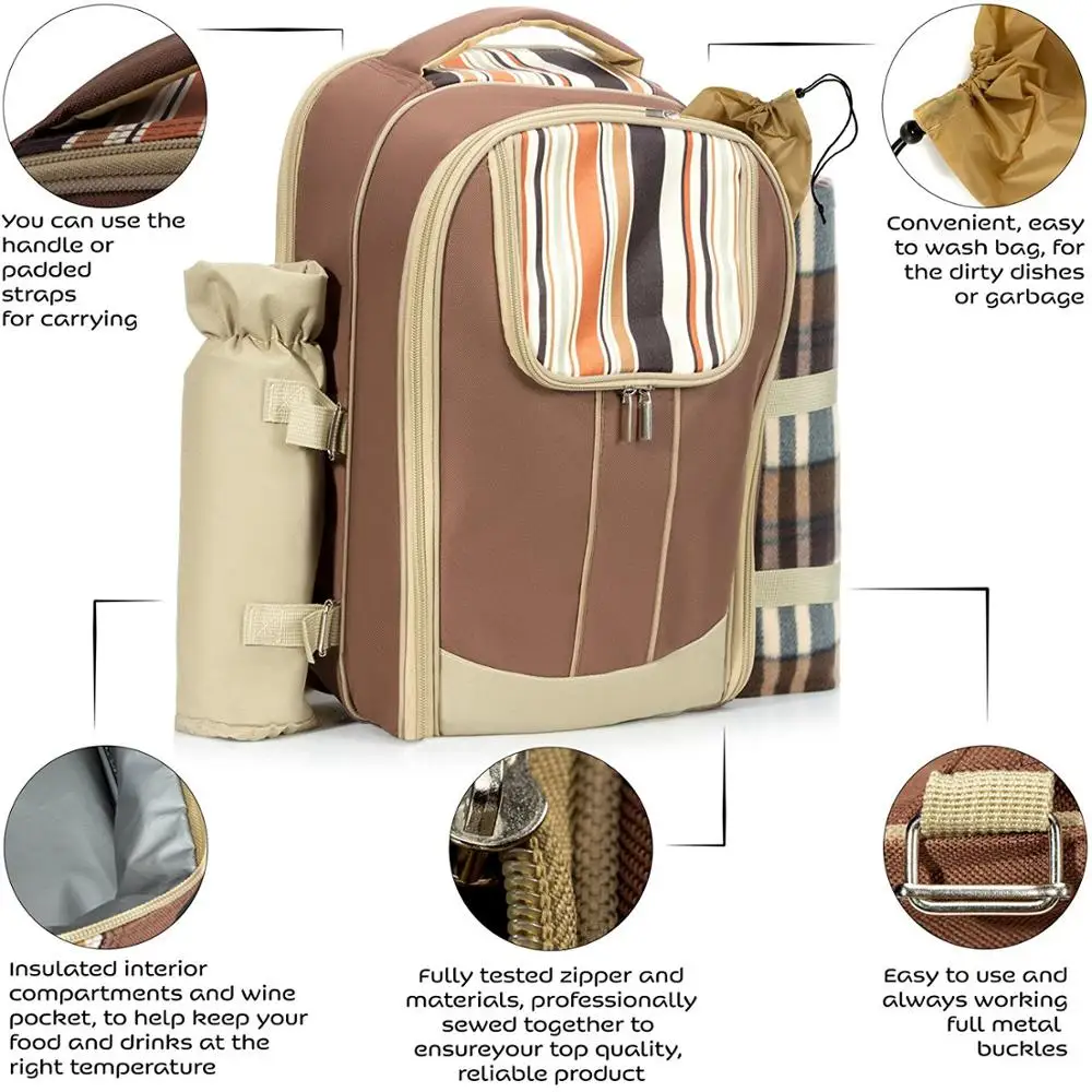 Picnic Backpack Basket Wine Cooler Stylish All in One 4 People Complete Tableware Set Waterproof Fleece Portable Picnic Bag