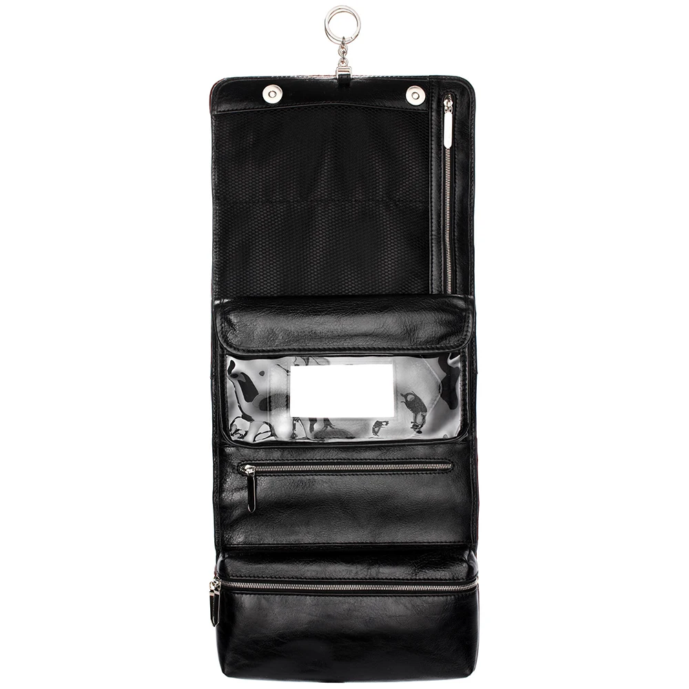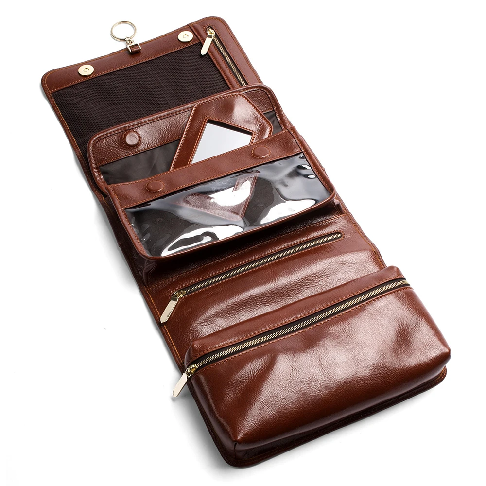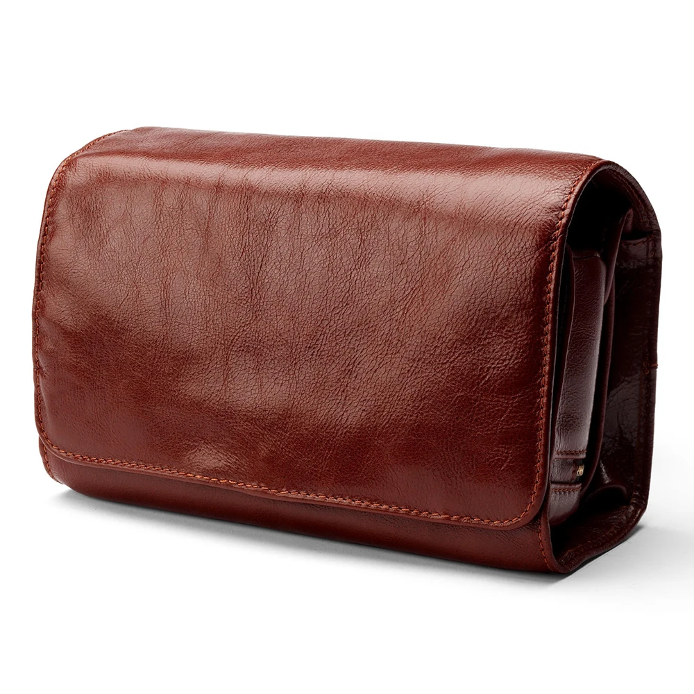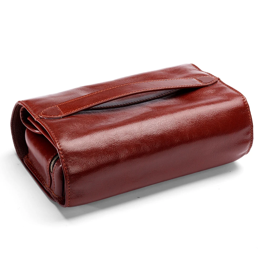 Custom Logo PU Cognac Leather Hanging Travel Shaving Dopp Kit Toiletry Wash Bag for Men