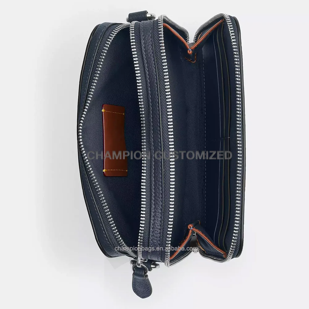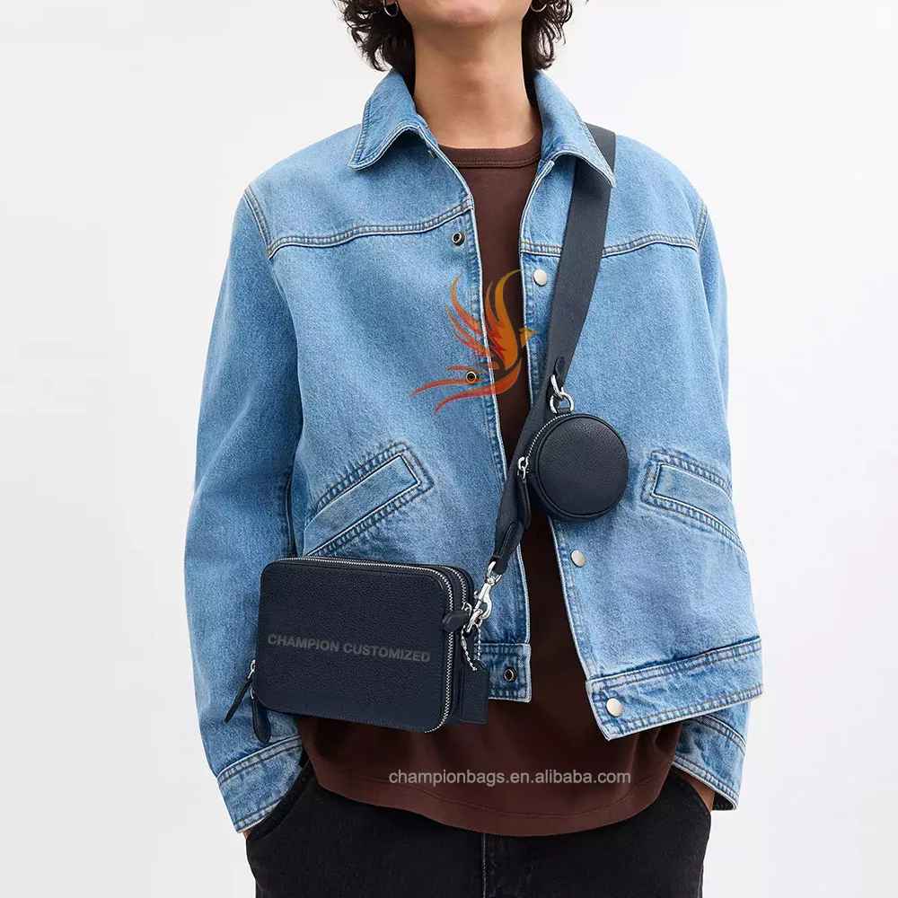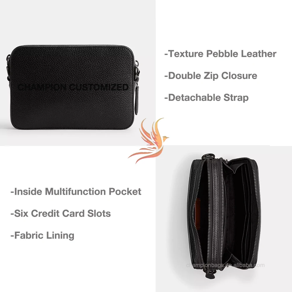 Custom Logo Luxury Vegan Pebble Leather Double Zip Square Crossbody Shoulder Messenger Bag for Men