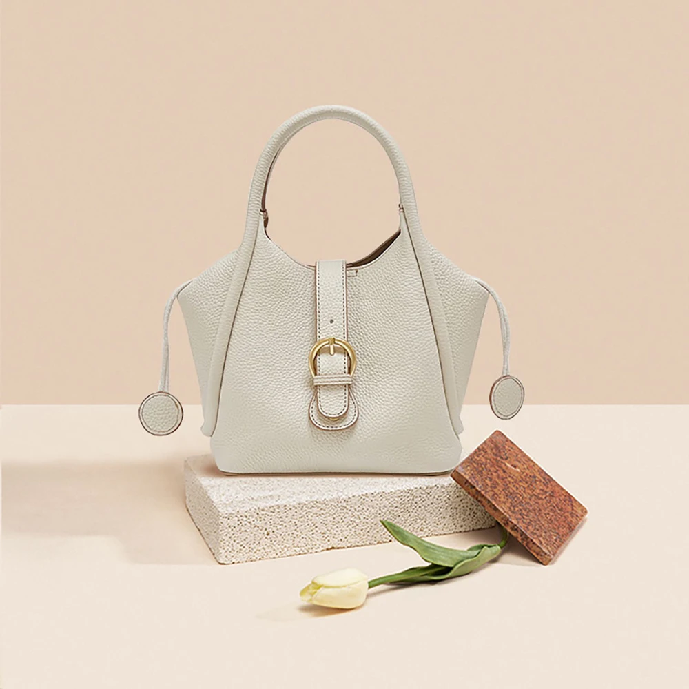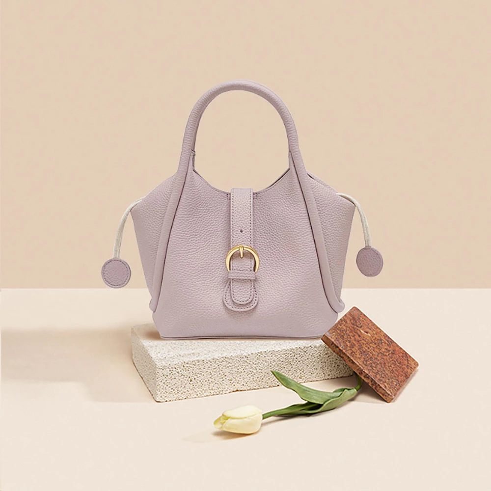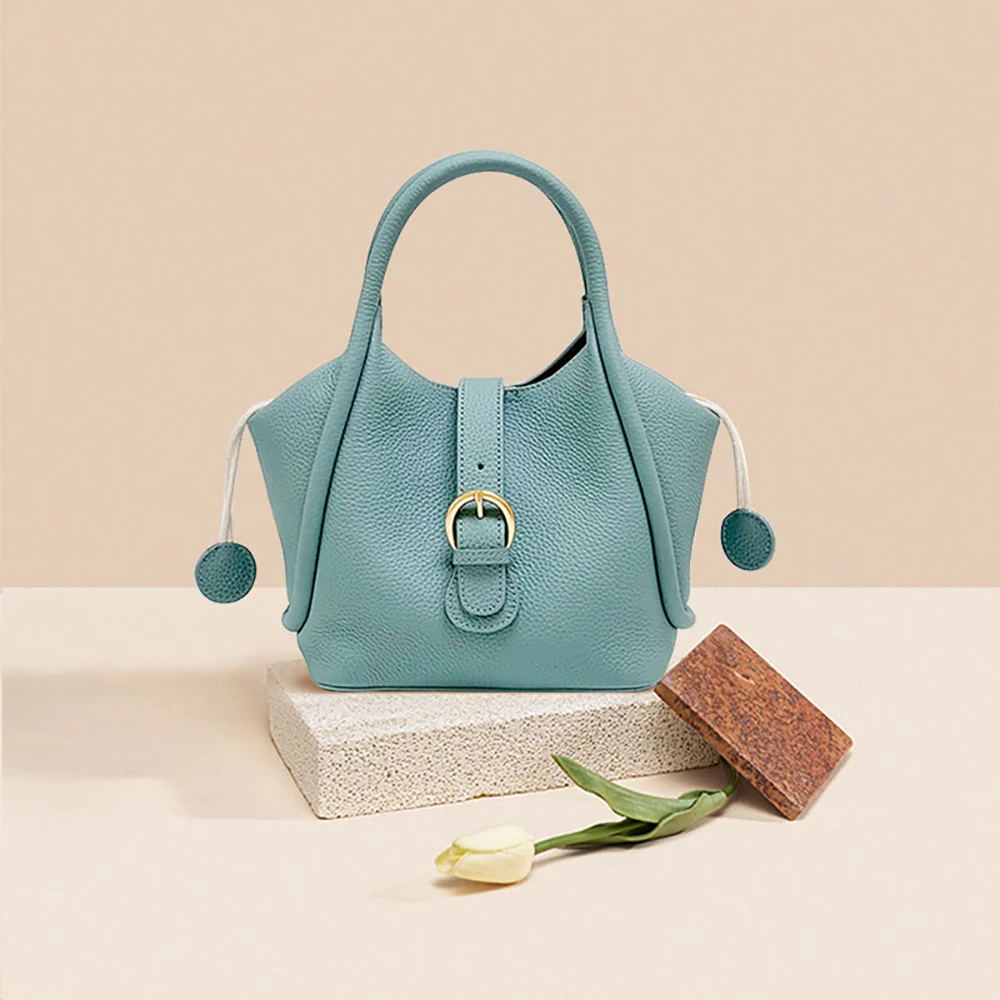 Portable Cute Lichee Patter Women Genuine Leather Handbag Fashion Luxury Real Cow Leather Bucket Bag