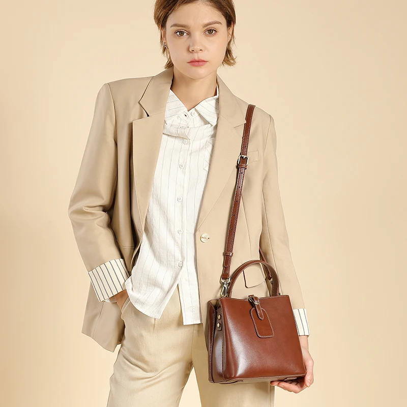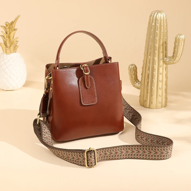 Handtaschen Supplier Custom Two Straps Waterproof Cross-Body Women Vintage Genuine Leather Adjustable Strap Bucket Bag