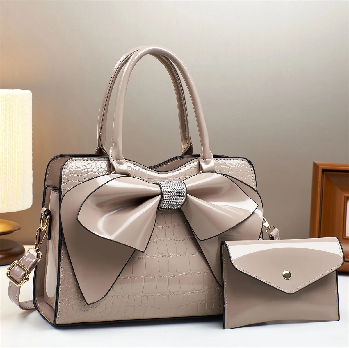 2 Pieces Set Handbag Glossy PU Leather Bow Know Tote Bag Women's Large 2 in 1 Shoulder Bags Gift for Lady