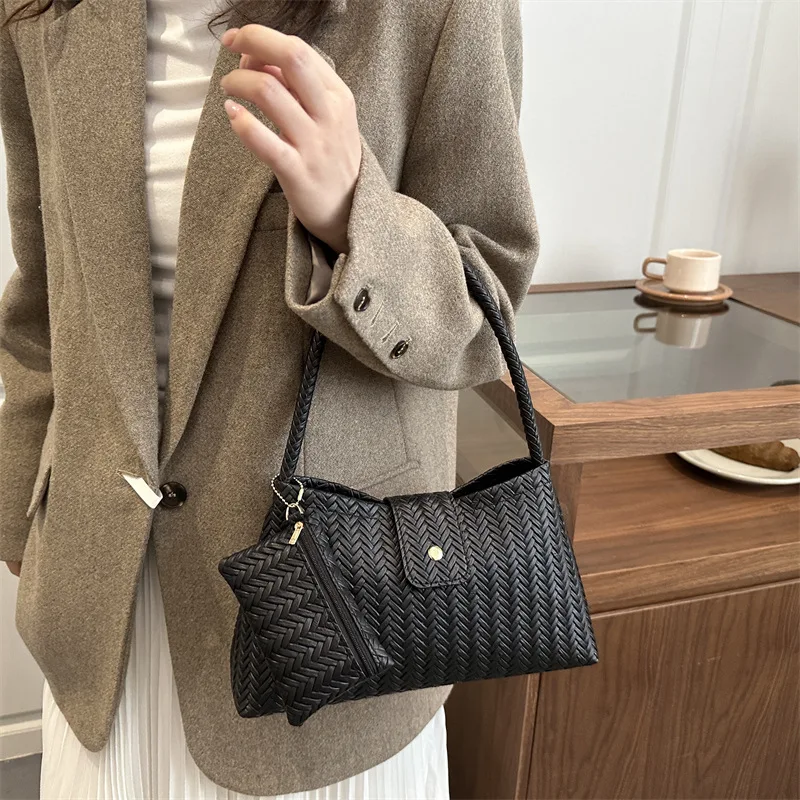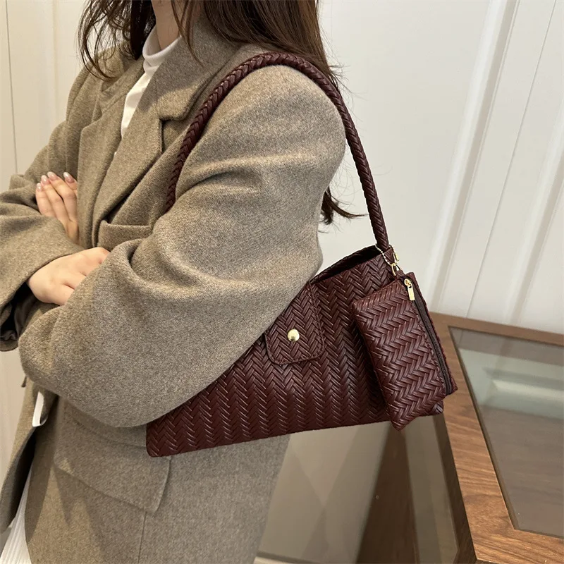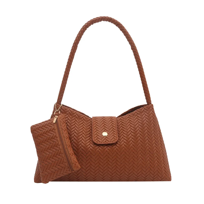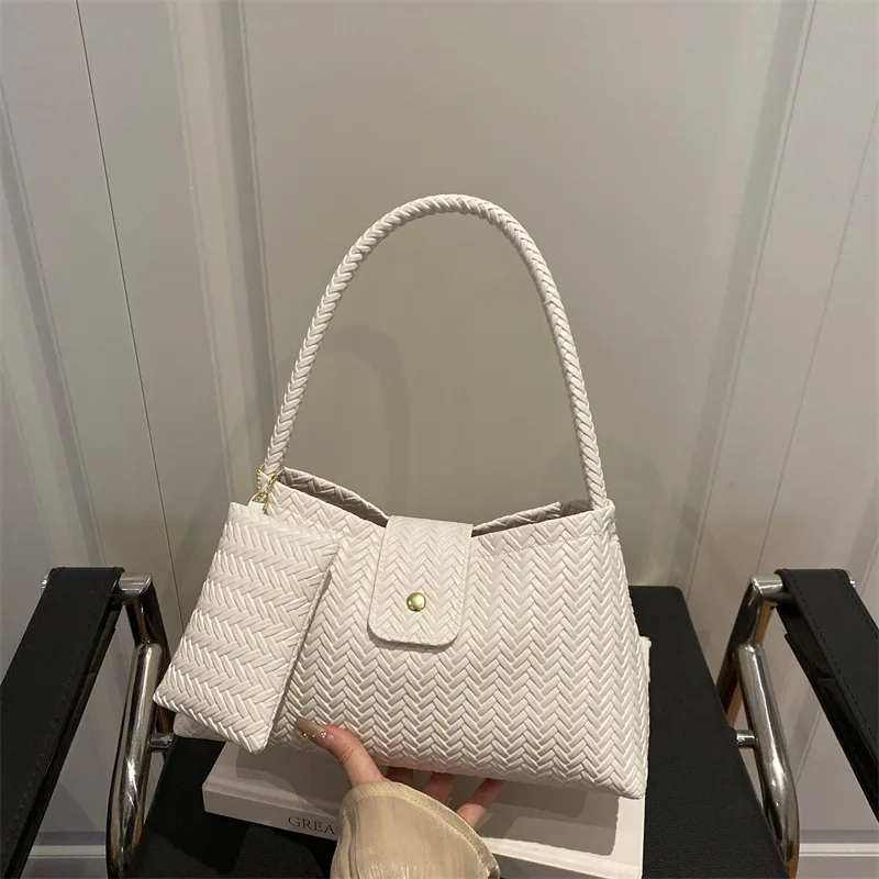 Ladies New Handbags 2 Pieces Set Woven Pattern PU Leather Underarm Shoulder Bags for Women