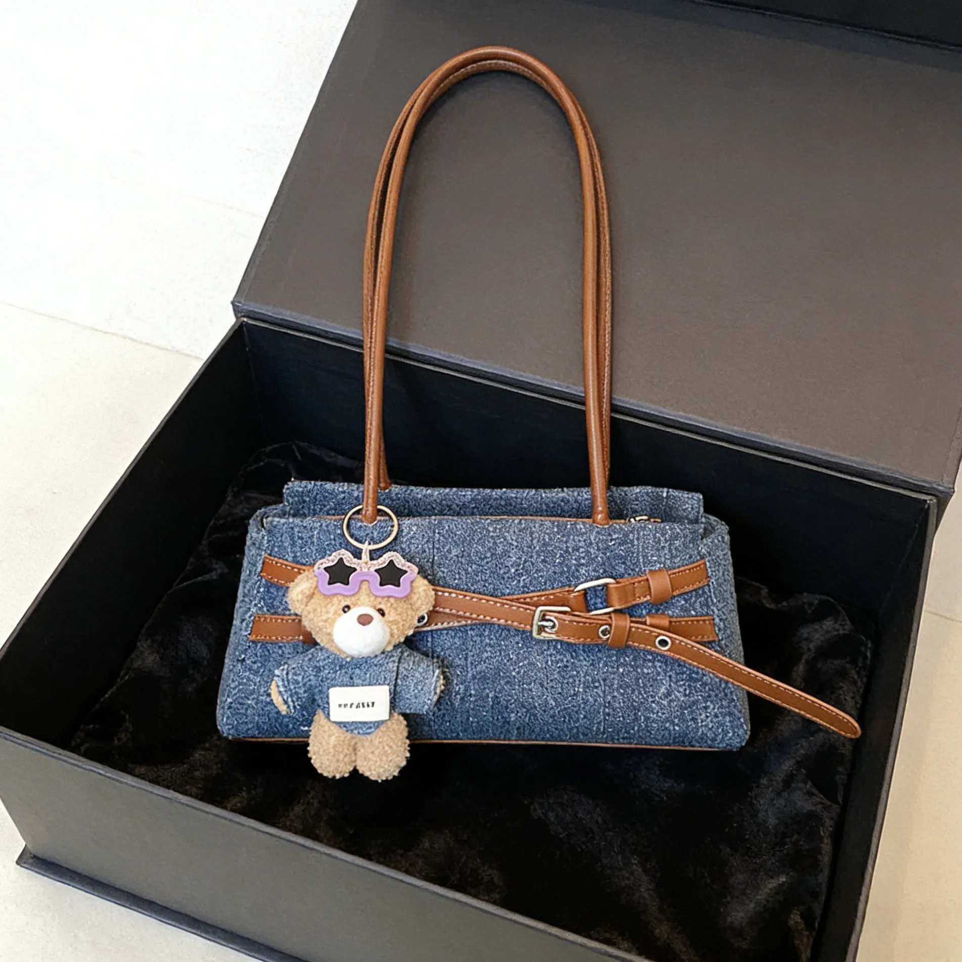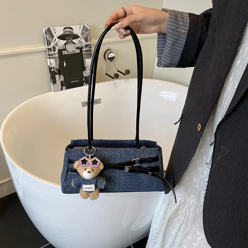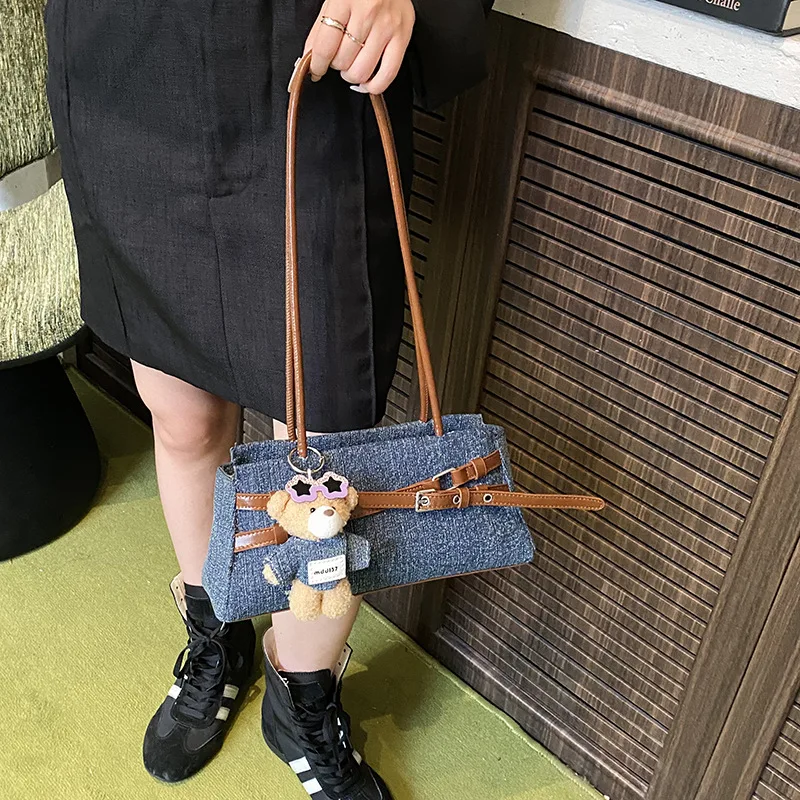 Horizontal Baguette Shoulder Square Bag 2026 New Denim Niche Design Shoulder Bag with Bear