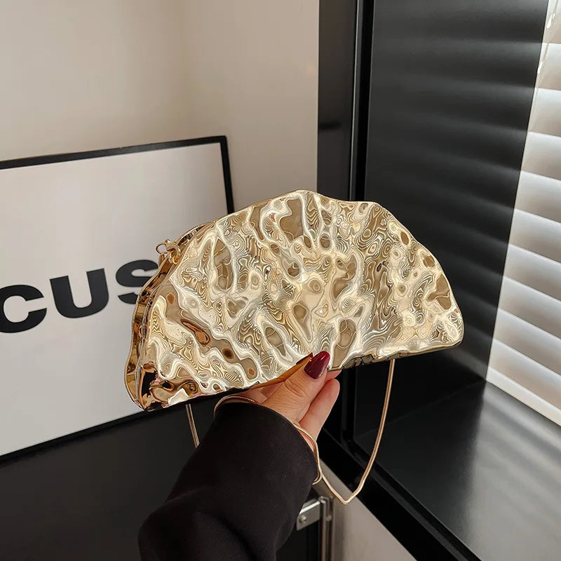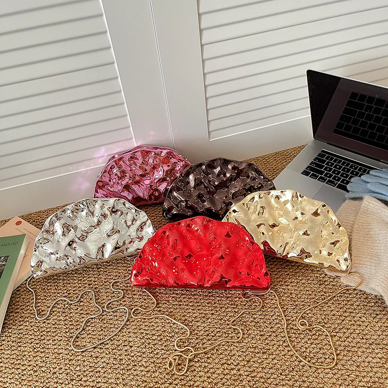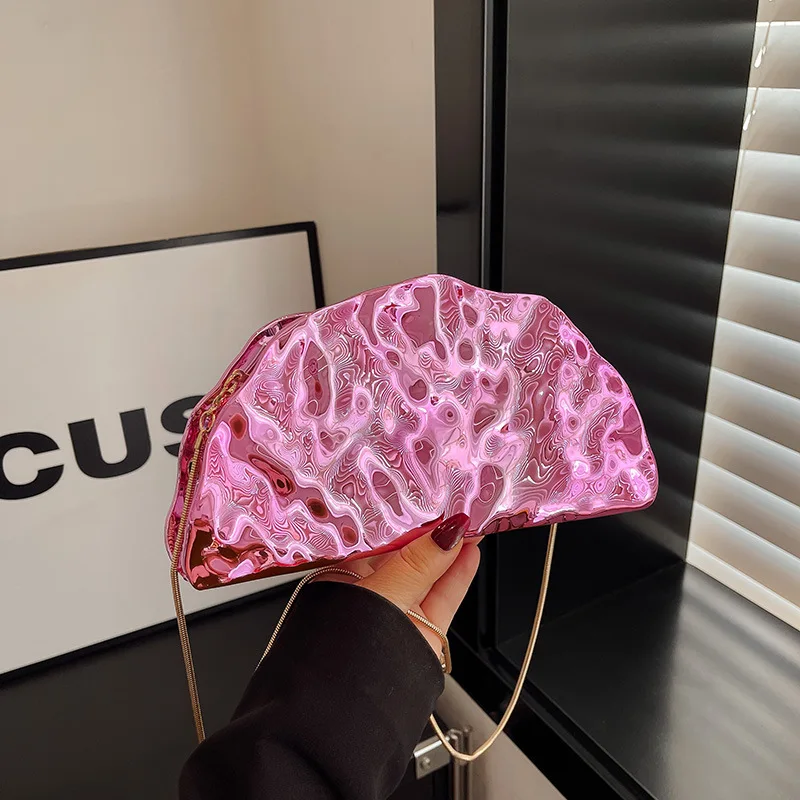 2026 New Fan Shaped Women's Crossbody Bag Shiny Crinkled Patent Acrylic Handbag with Chain Strap Shoulder Bag for Evening Party