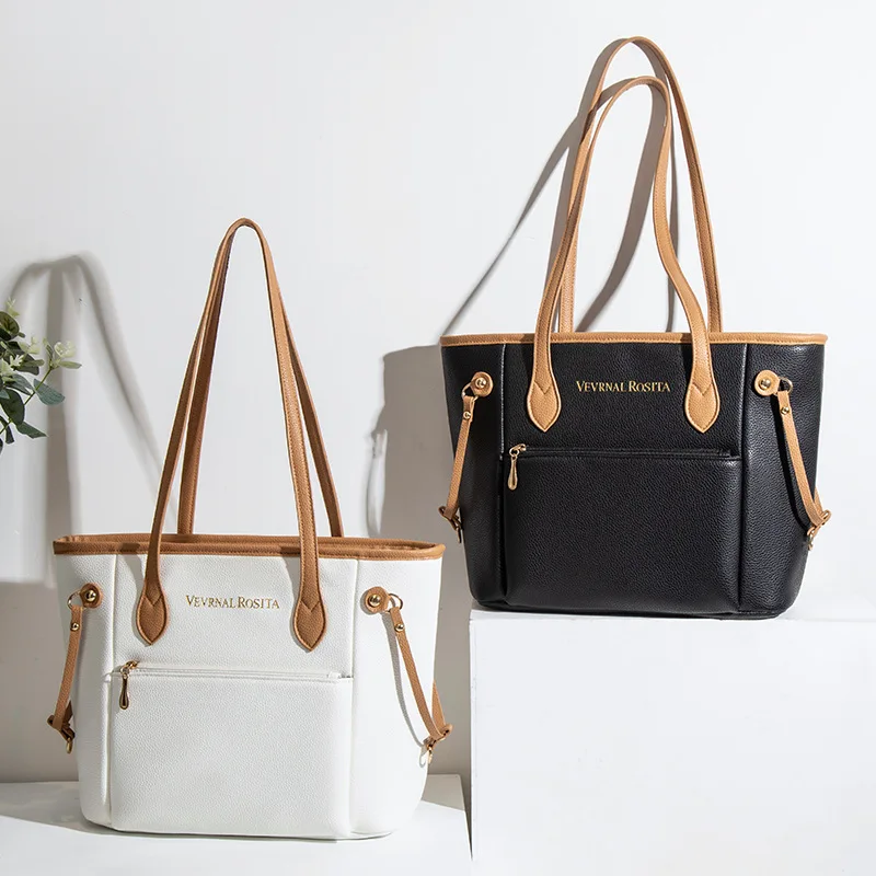 2026 Trendy Women's Large Capacity Tote Bag PU Leather Contrast Strap Handbag with Front Zipper Pocket
