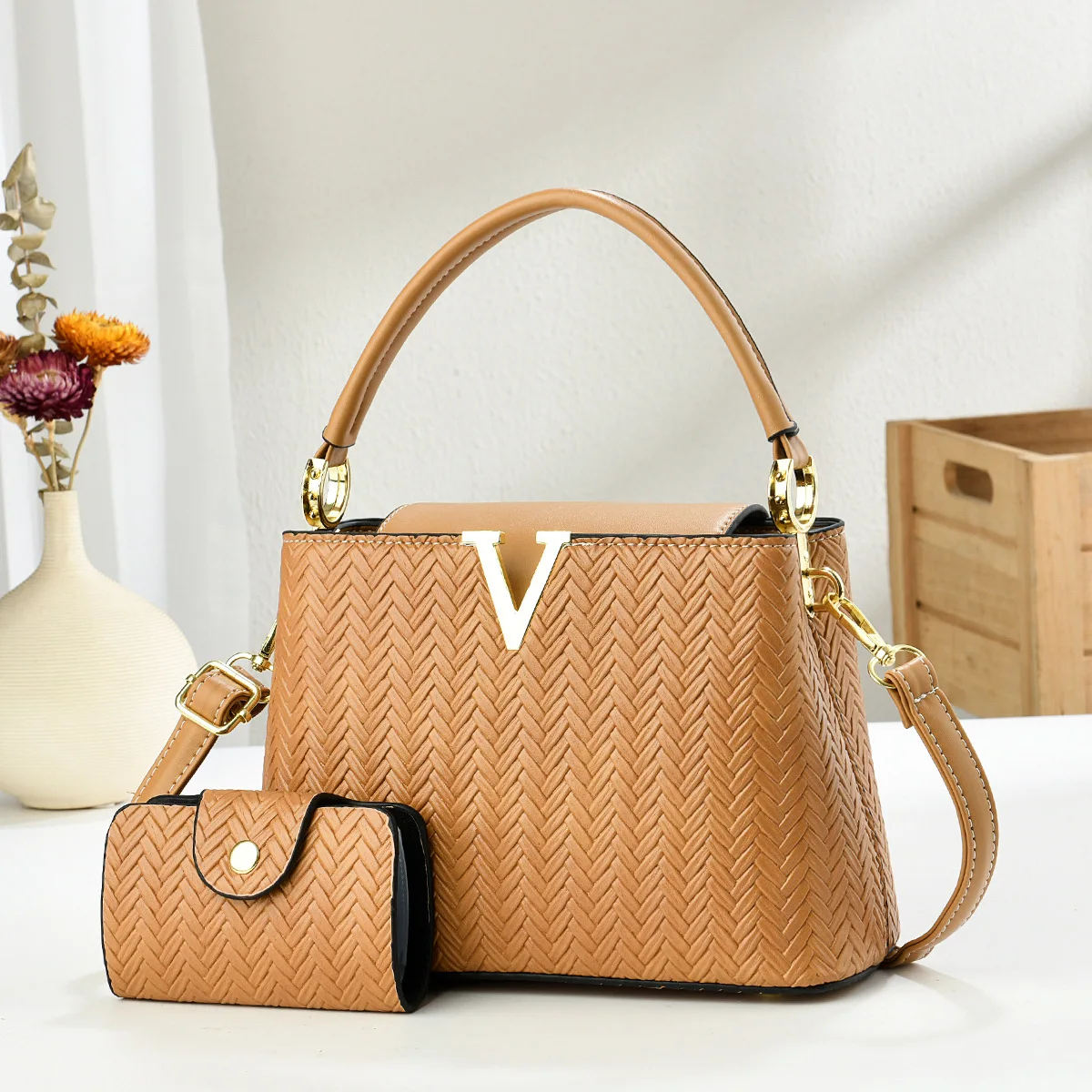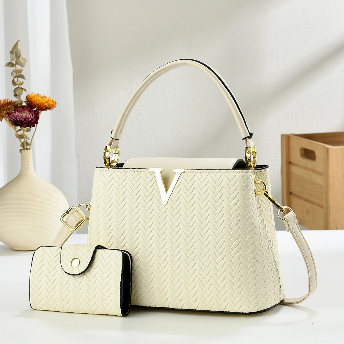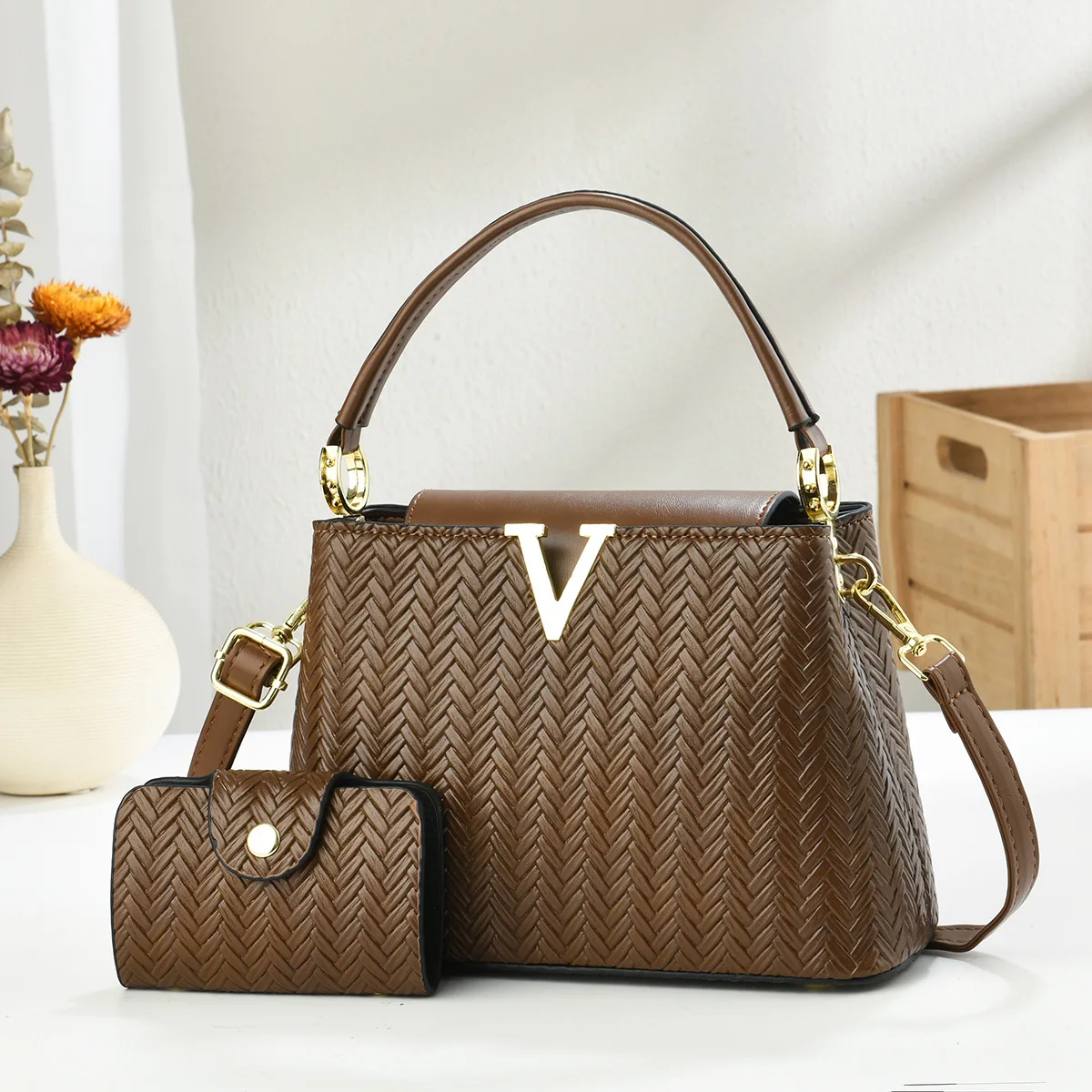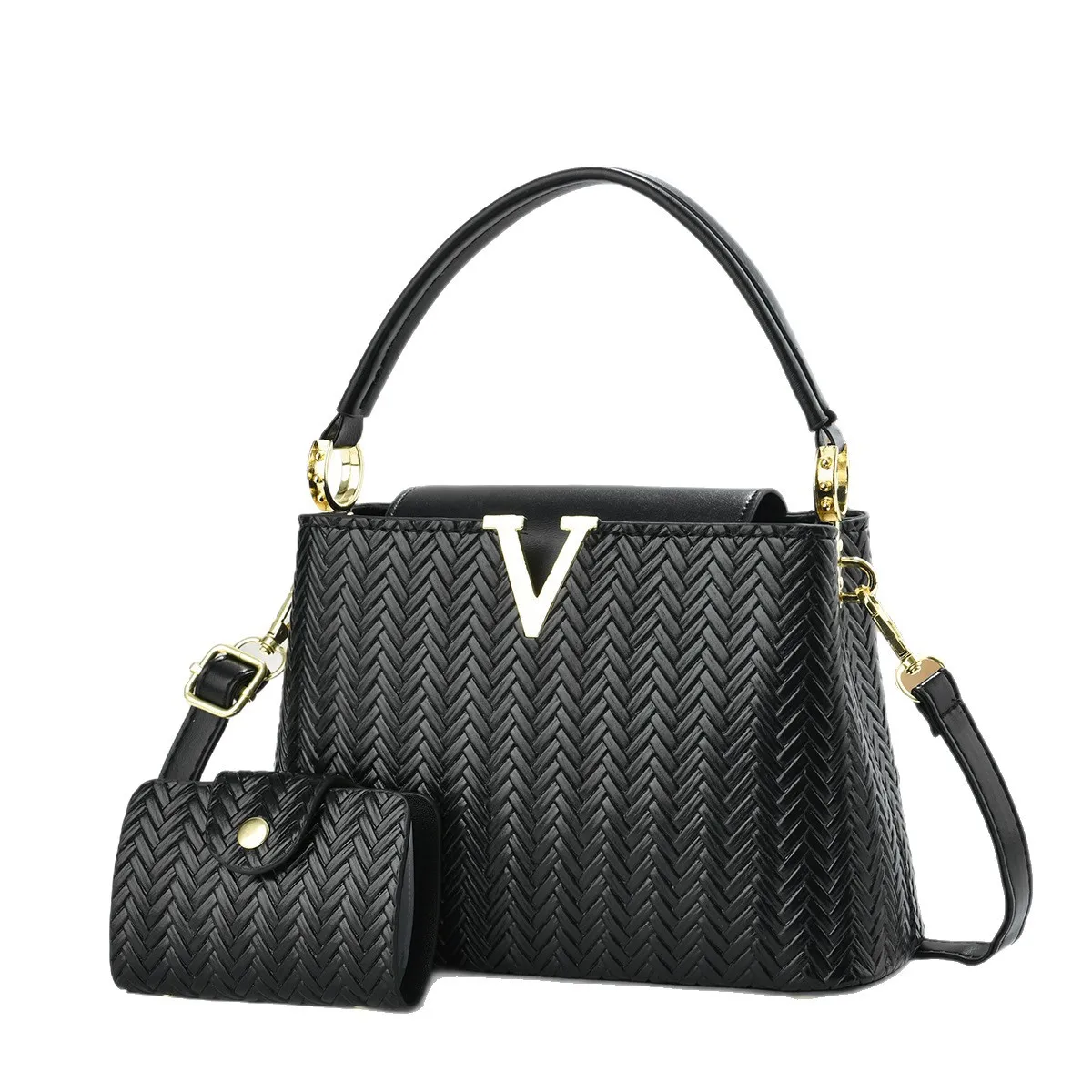 Women's Woven Texture Handbag 2 in 1Set with Metal V Embellishment Ladies Shoulder Bag
