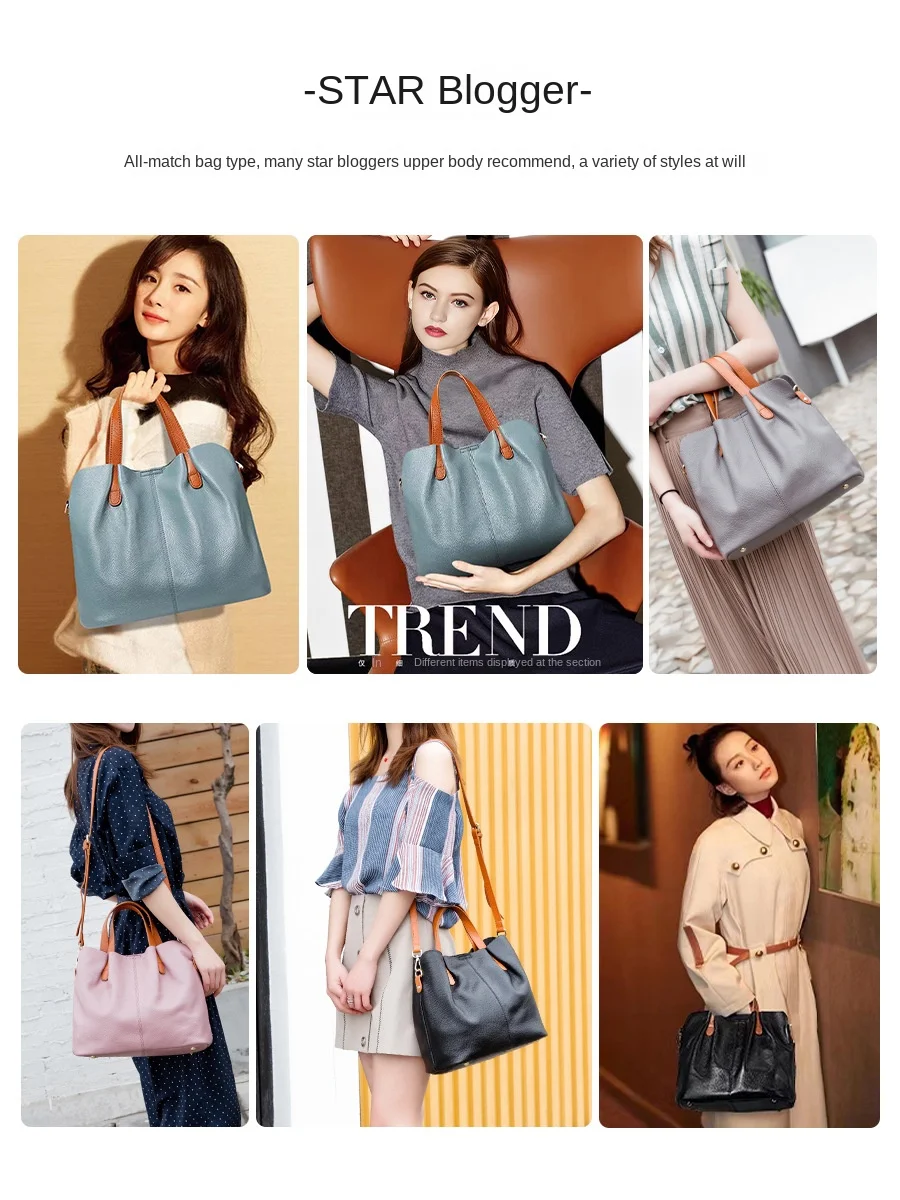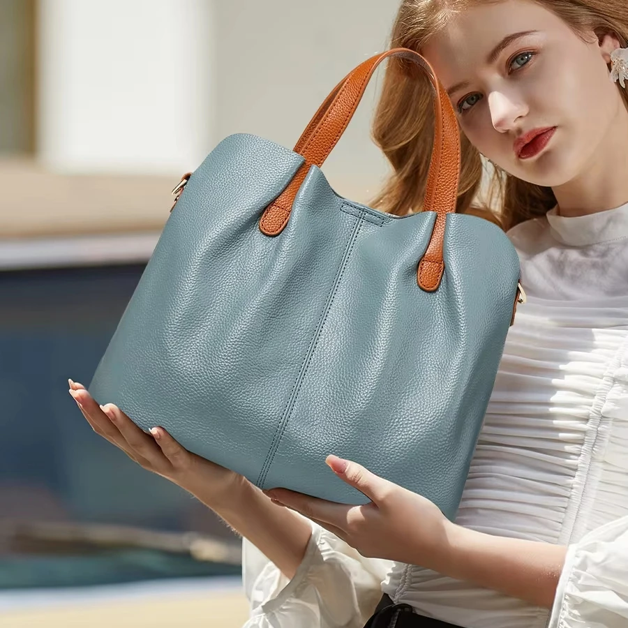 A-110 Women's High-Level Large-Capacity Work Tote Handbag Genuine Cowhide Leather Polyester Zipper Simple Design Contrasting