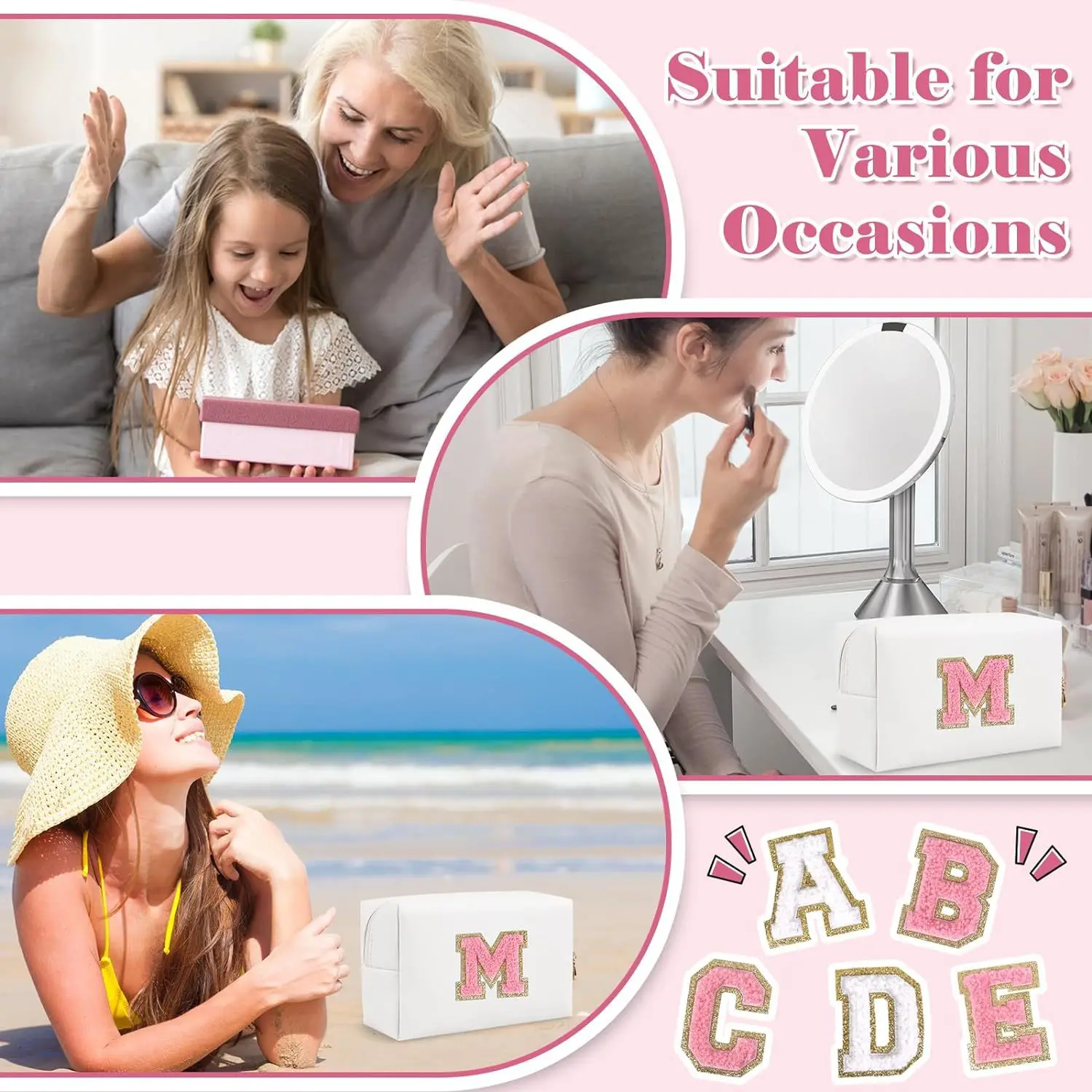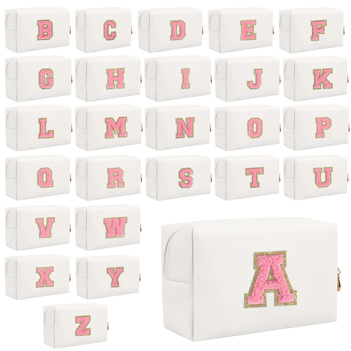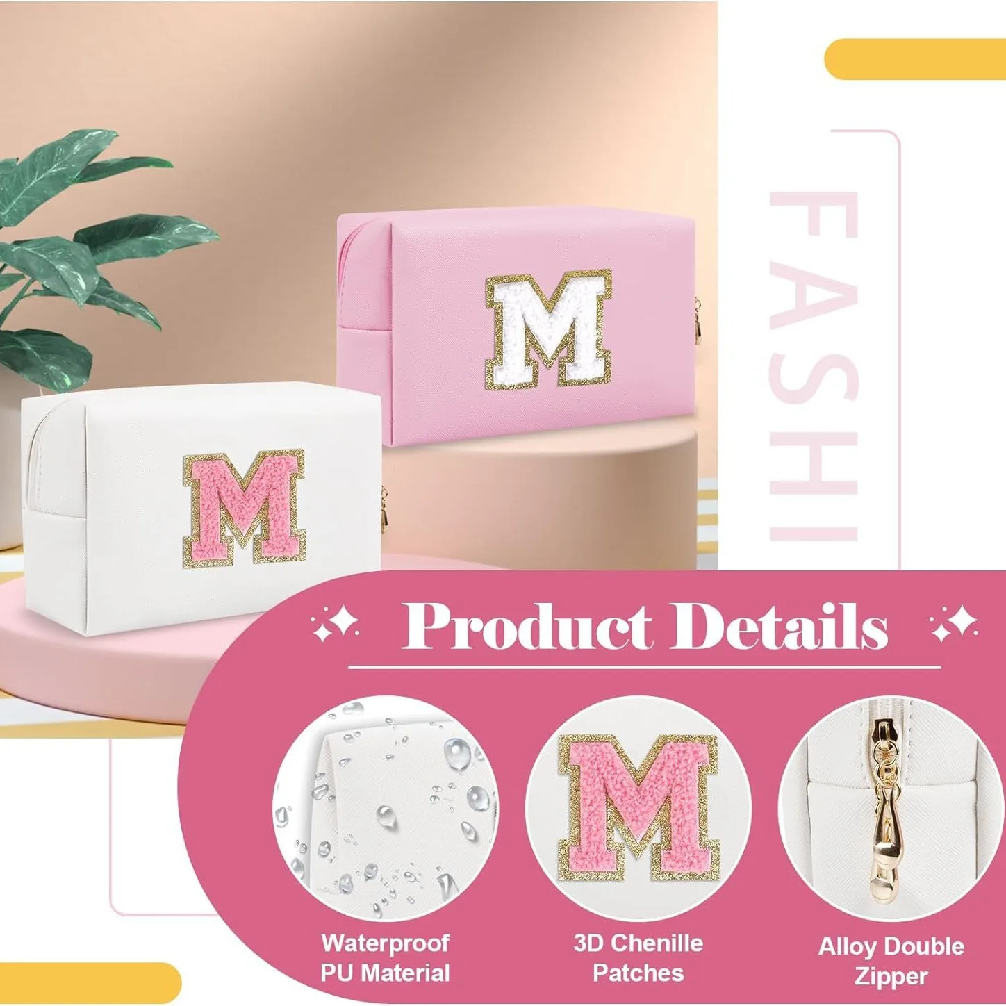 Initial Preppy Patches Personalized Makeup Bag PU Leather Travel Monogrammed Cosmetic Bag Toiletry Pouch for Teen Girls Women