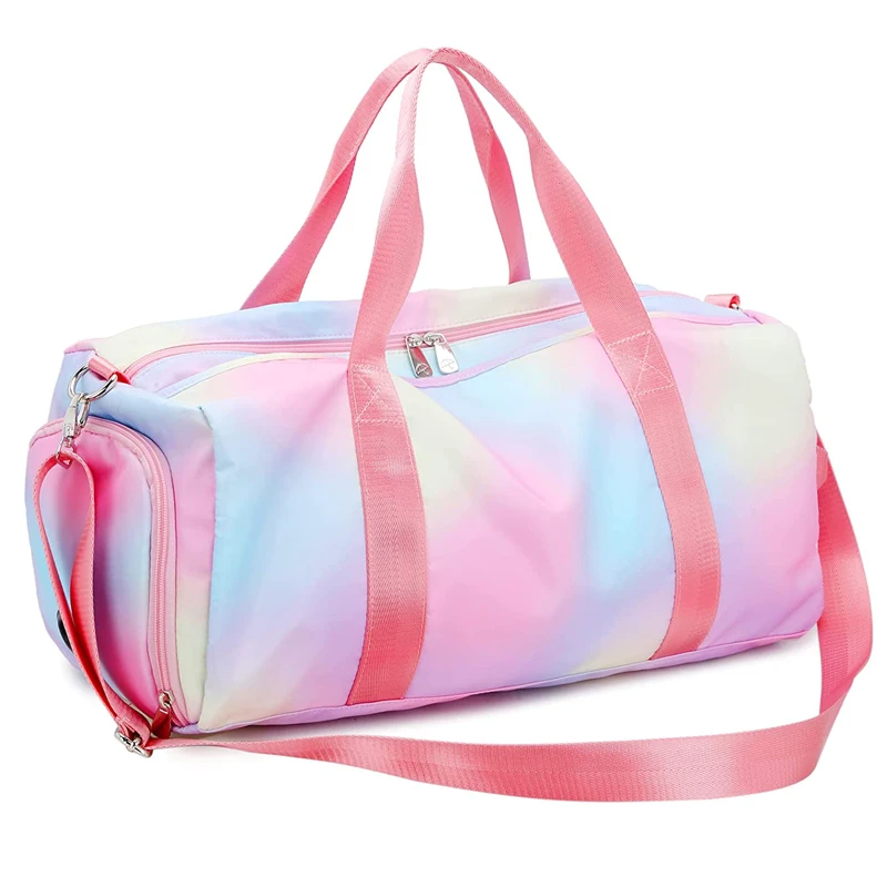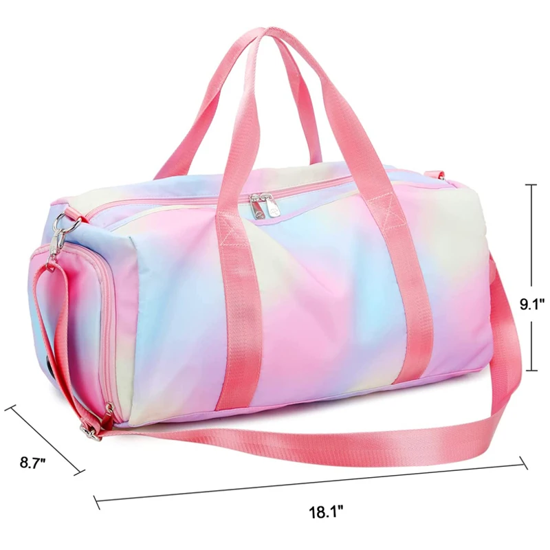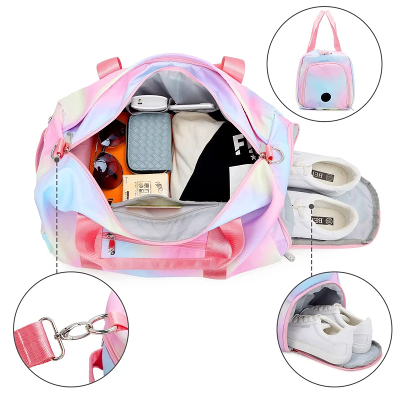 Custom Logo Cute Pink Rainbow Girls Kids Gym Sport Dance Bag Weekend Duffel Overnight Bags with Shoe Compartment Wet Pocket