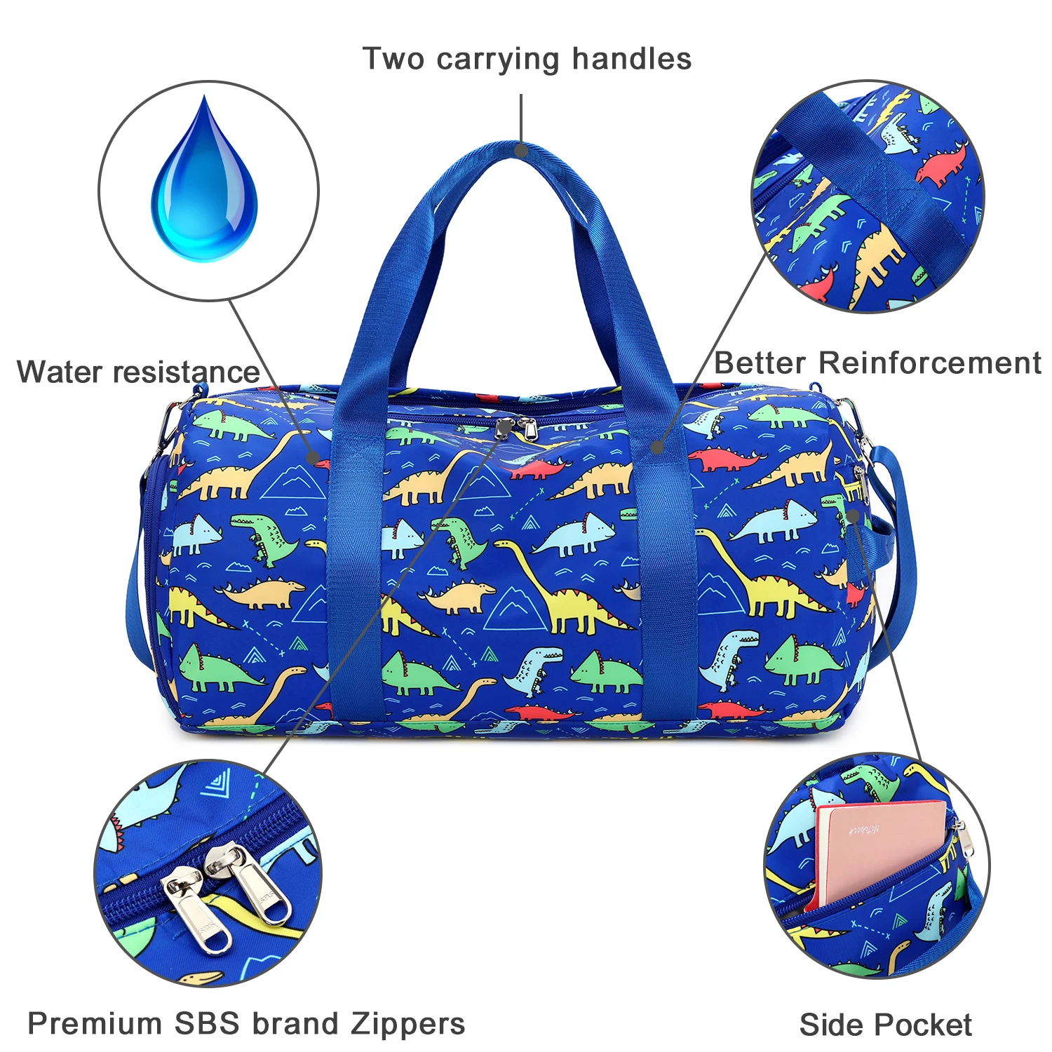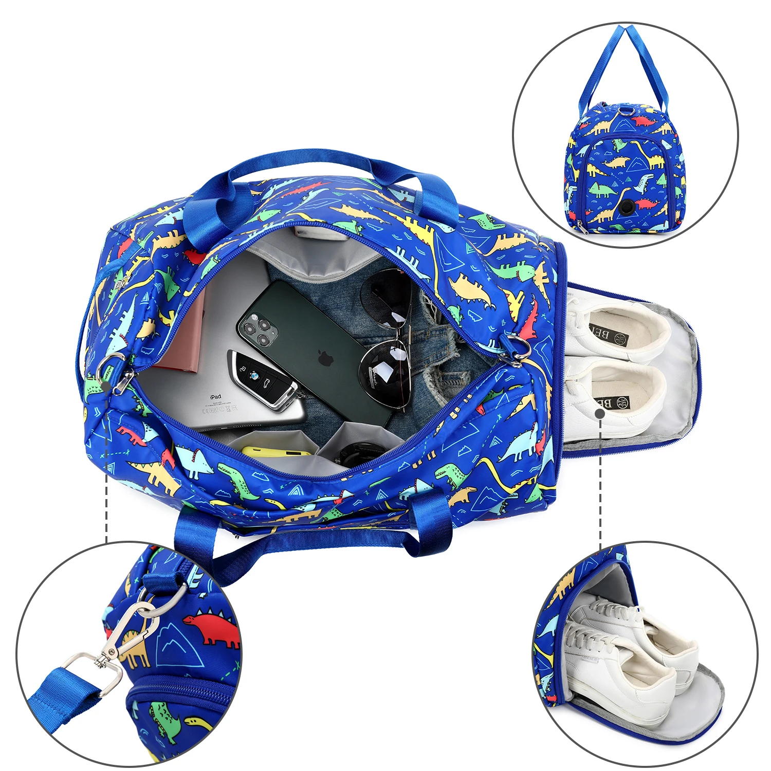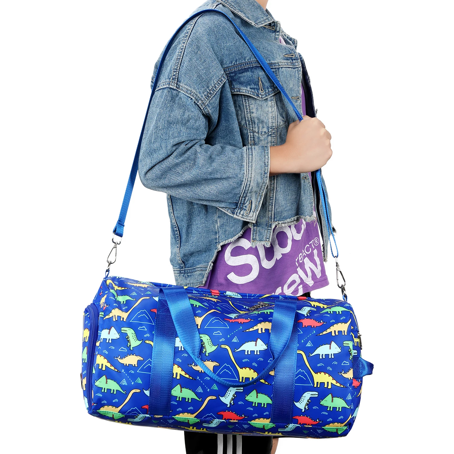 Unisex Dinosaur Blue Polyester Overnight Duffel Tote Bag for Kids Zipper Closure Sport and Fashion Travel Carry on Shoes Bag