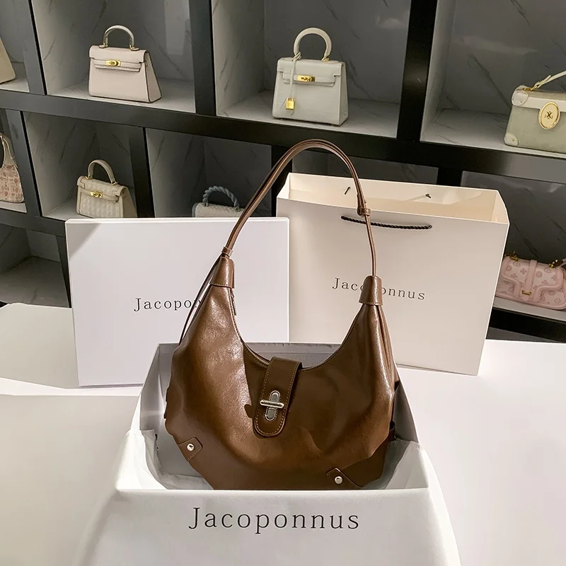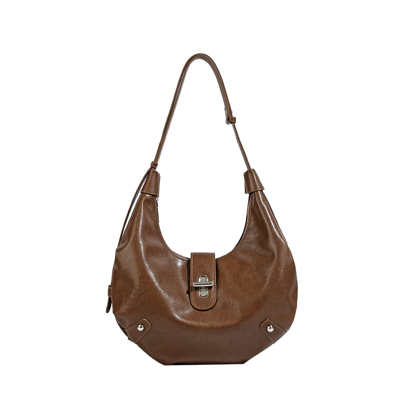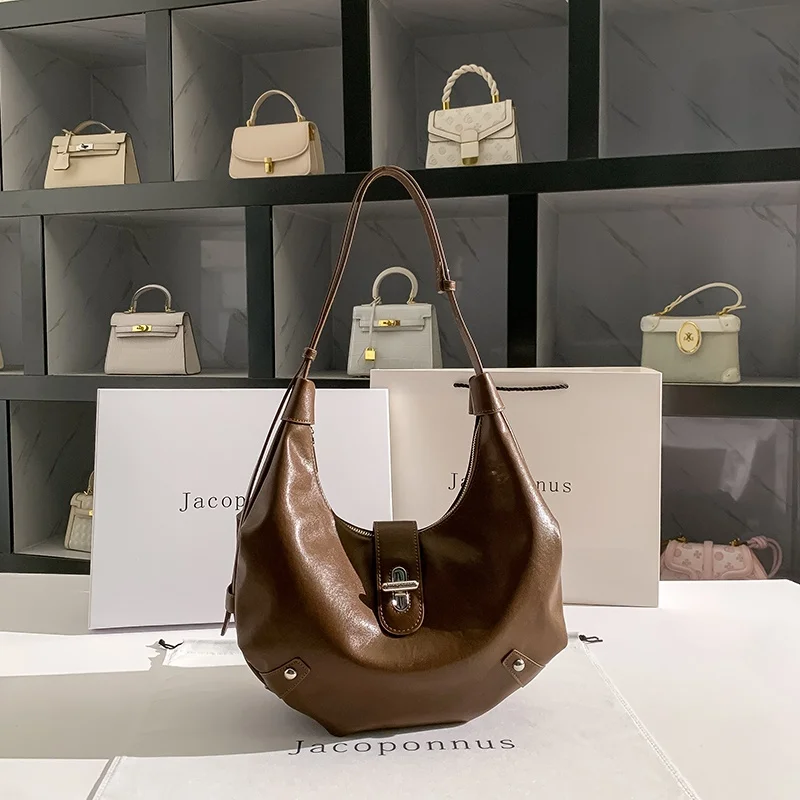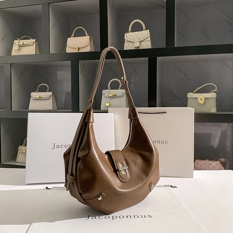 2026 Fall Luxury Women's Brown Half Moon Horn Zipper Closed Shoulder Bag New Fashion Style with Leather Underarm Bag