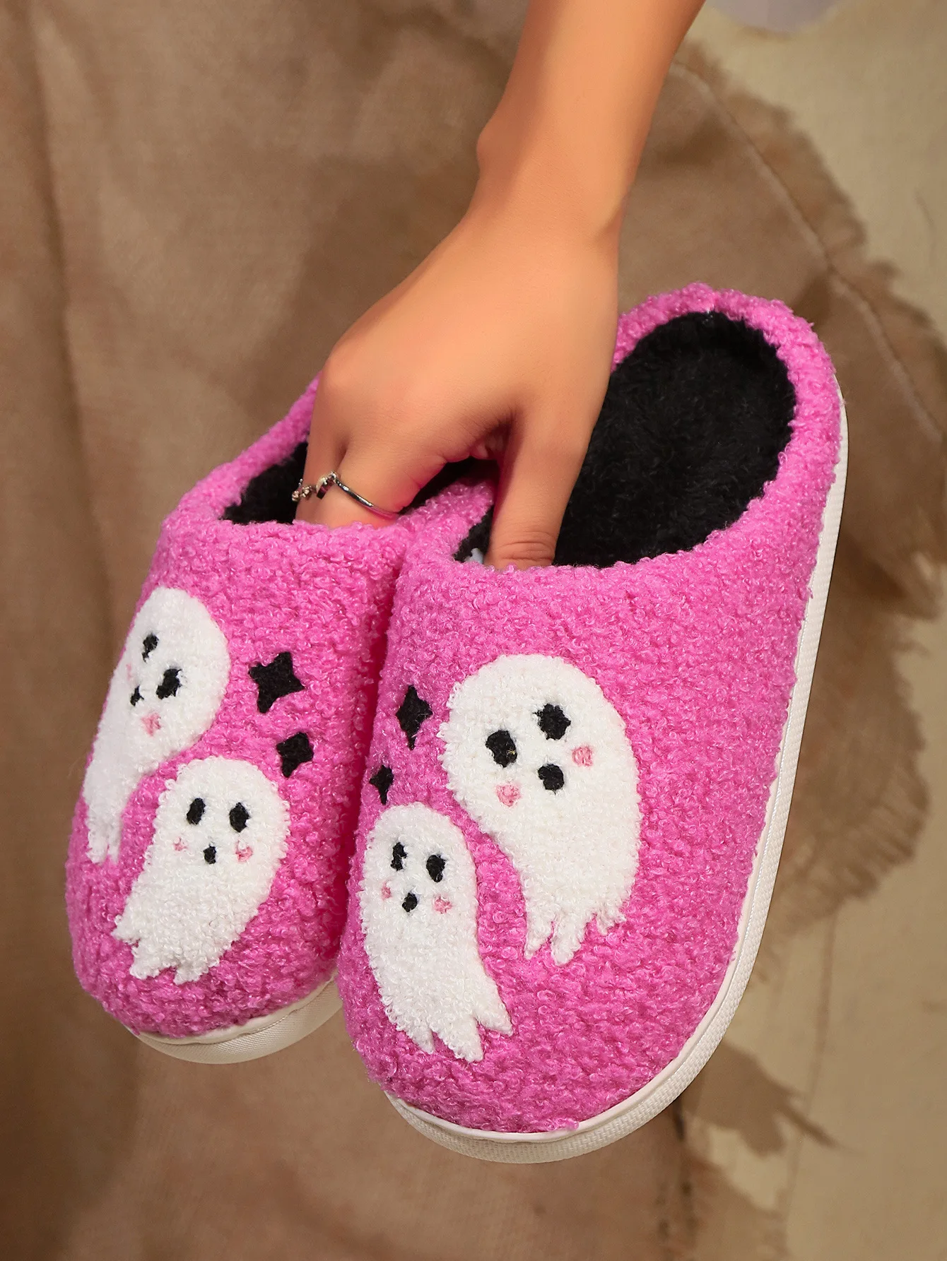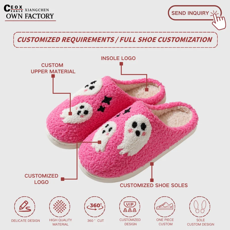 Winter Home Soft Hotel for Pink Fuzzy Pattern Witch Skull Head Boo Bat Spider Web Pumpkin Halloween for Women Men Cotton Shoes