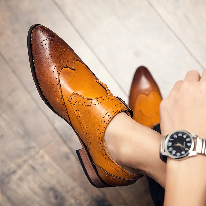 Handcrafted Elegant Pu Leather Wingtip Monk Strap Italian Shoes Men Brogues with Buckle Dress Shoes Oxfords
