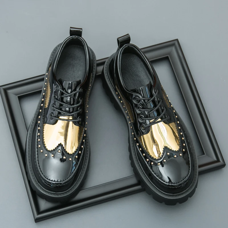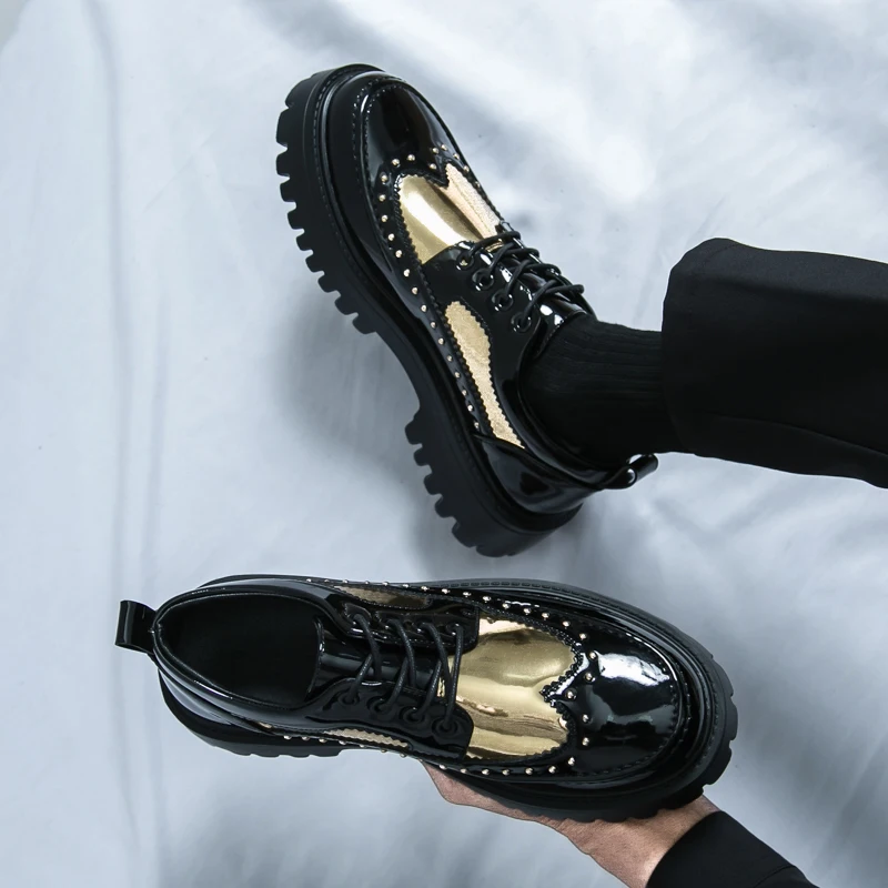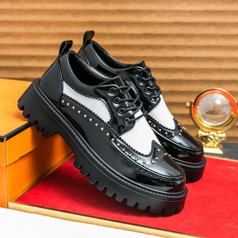 Men's Pu Leather Casual Formal Brogue Style Youth Round Toe Thick-Soled High Heels Mens Business Dress Platform Shoes