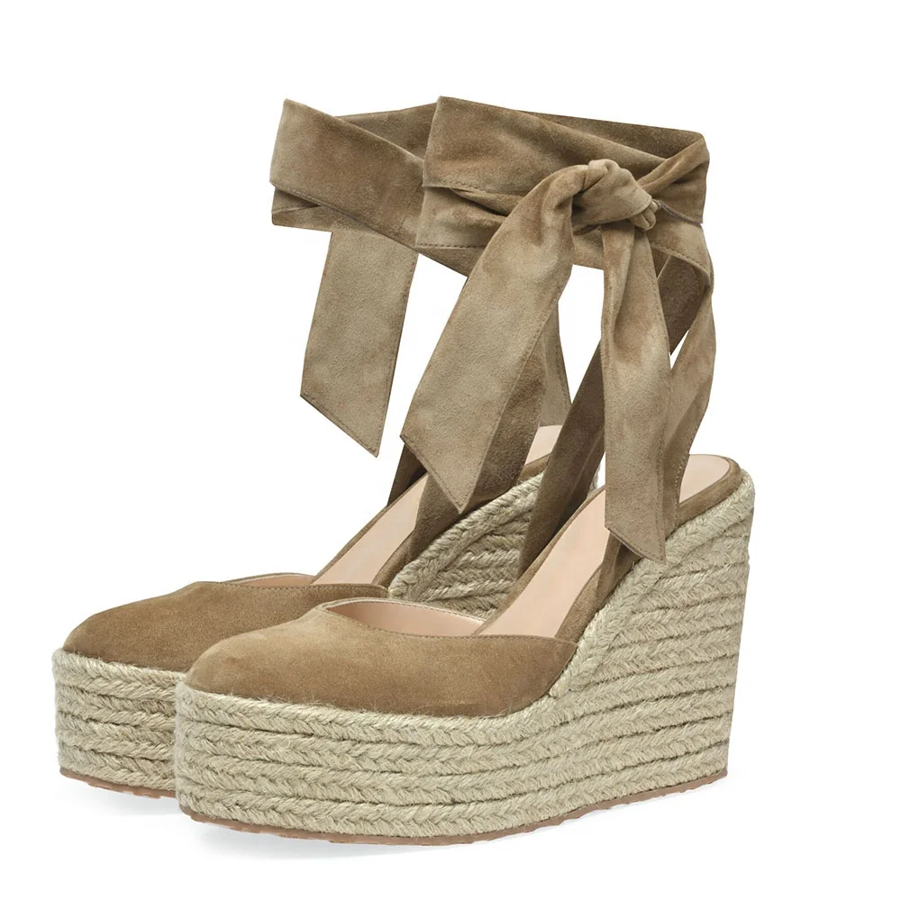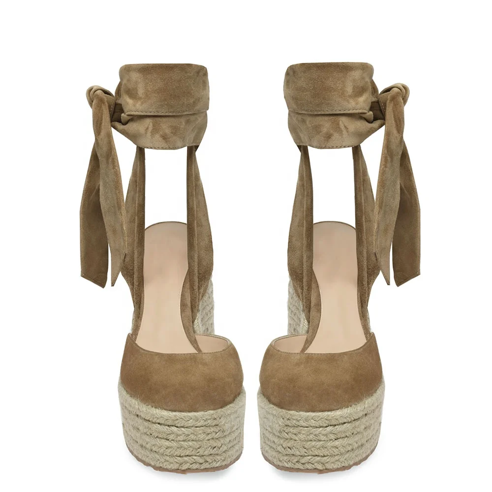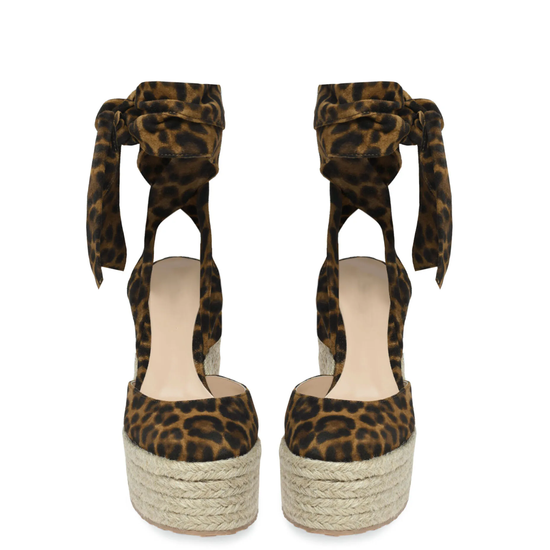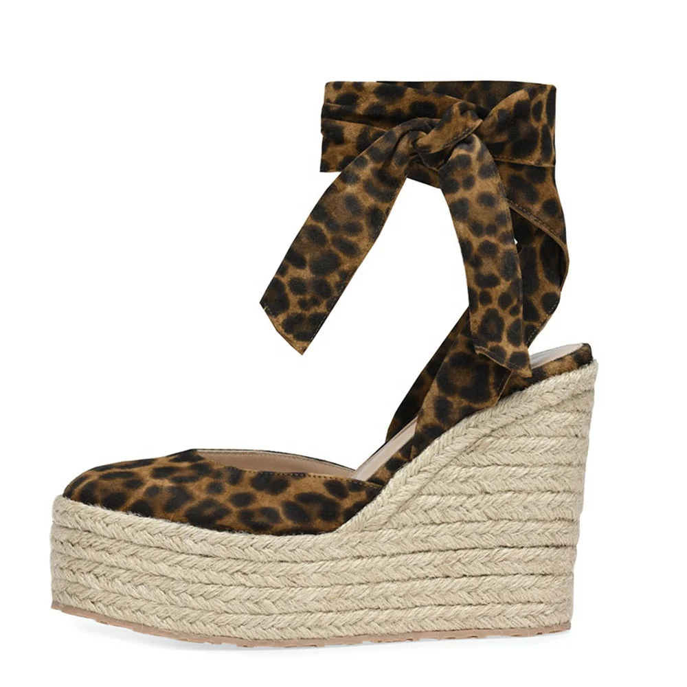 Closed Toe Wrap Around Heels Platform Chunky Wedges Heel Sandals Ankle Strap Cheetah Leopard Suede Espadrilles