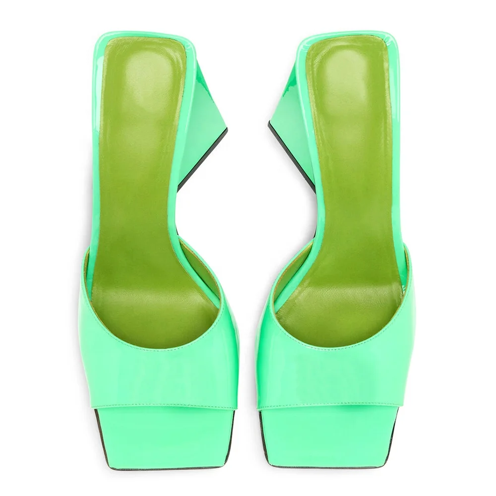 Trendy Evening Party Green Square Toe Chunky High Heels Slippers Pyramid Heel Summer Mules Heeled Sandals for Women and Ladies