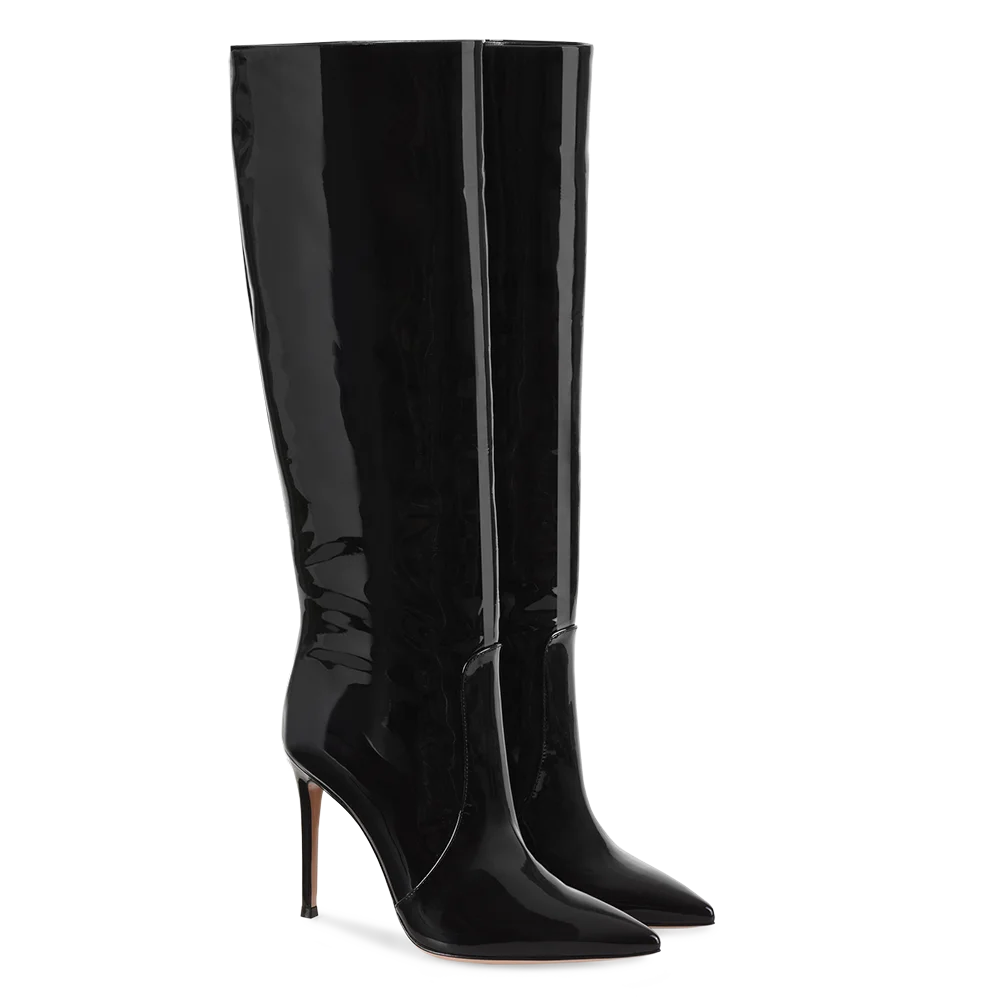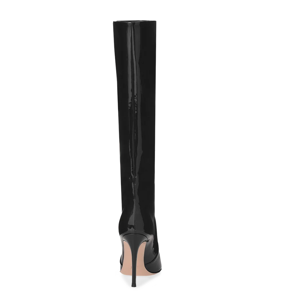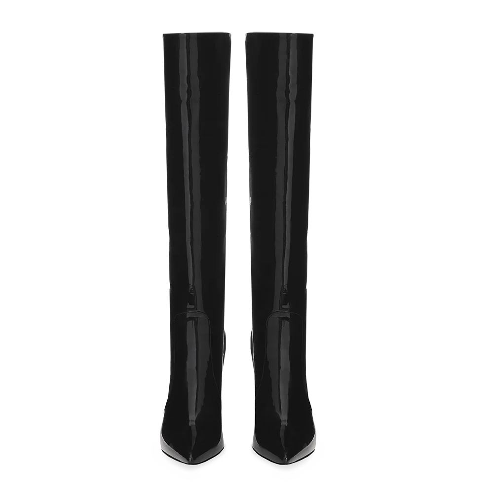 Trending Black Shiny Patent Leather Ladies Pointed Toe Thin Heel Knee High Boots Winter Women Long Boots Female Shoes