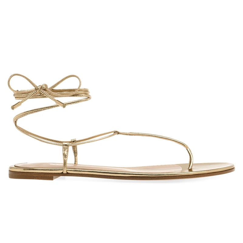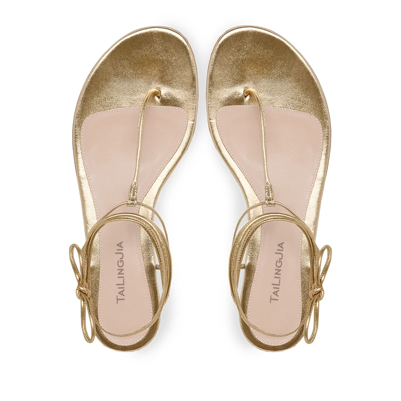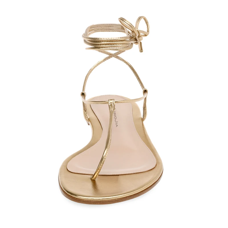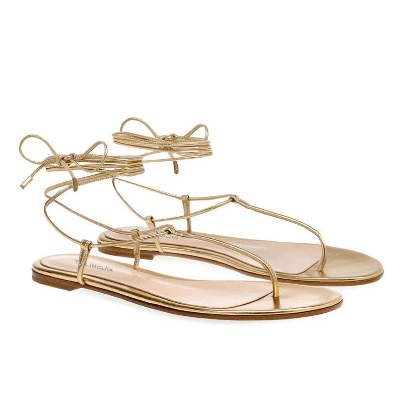China Lady Shoes Factory Gold PU Leather Strappy Thong Flip Flops Flat Sandals for Women
