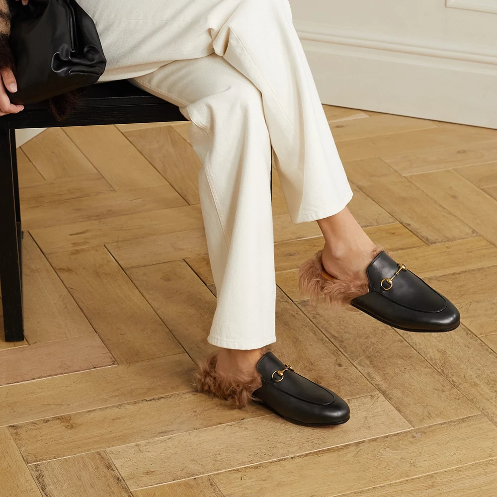 Wide Fit Black Fluffy OEM Flat Closed Toe Mules Women Shoes Buckled Backless Mule Loafers With Fur