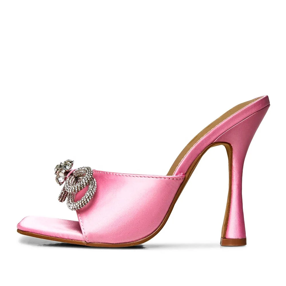 2022 Plus Size Women Satin Summer Outdoor Square Toe Mules Diamond Bow High Heels Luxury Heeled Sandals Height Increasing