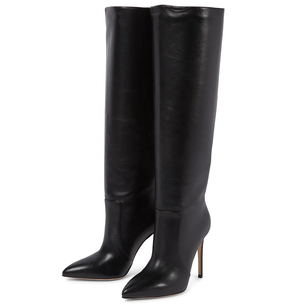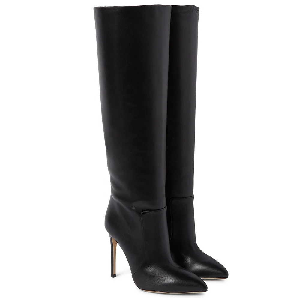 Black PU Leather Ladies Boots 2022 Casual Style Knee Boots Stiletto Heel Pointed Toe Plus Size Women Shoes