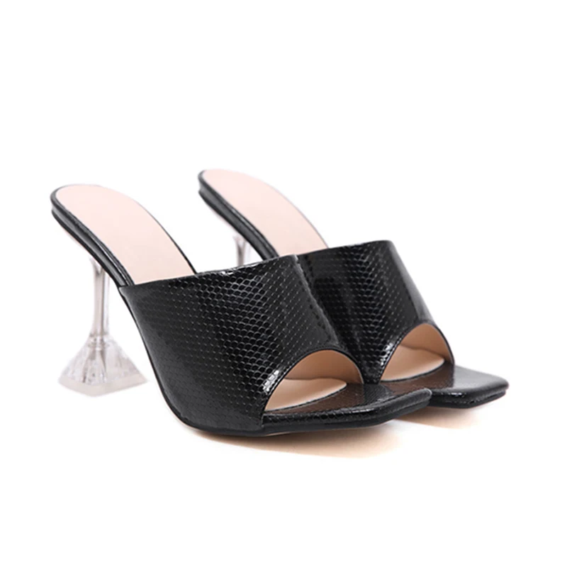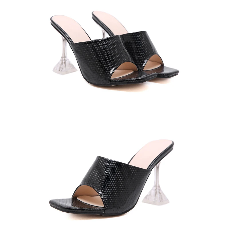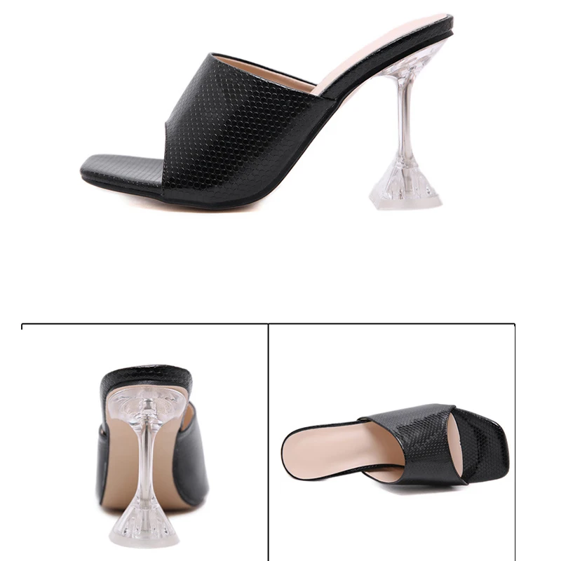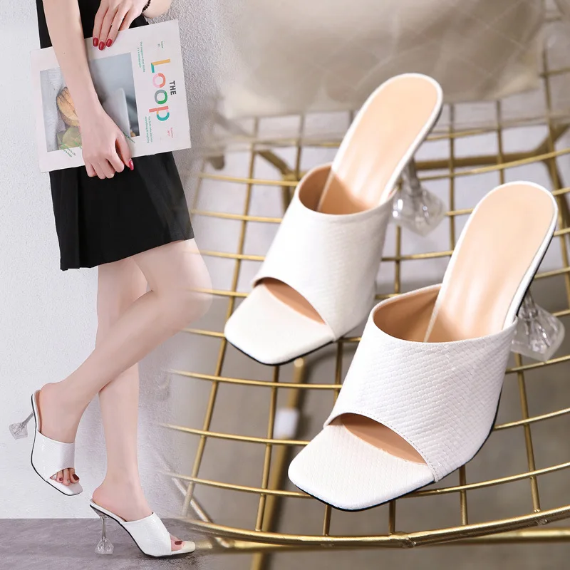 Casual White Snake Print Mules Square Toe High Heels Crystal Heel Sandals for Women Plus Size Slippers