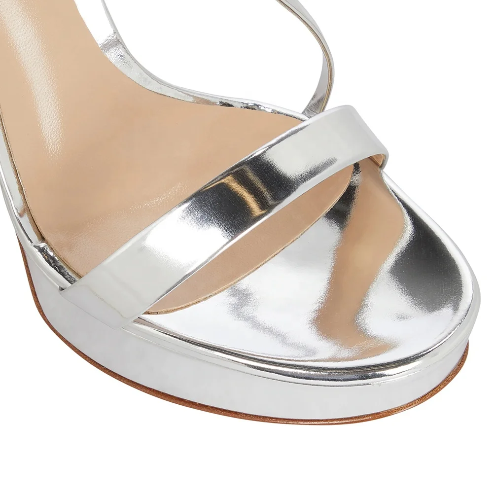 Factory Wholesale Silver PU Thick Heel Platform High Heels Ankle Buckle Strap Open Round Toe Party Wedding Shoes