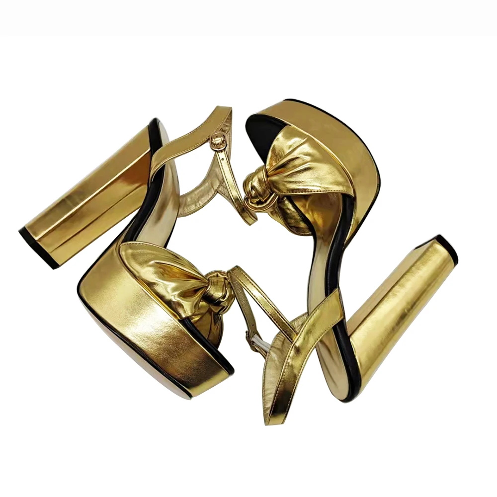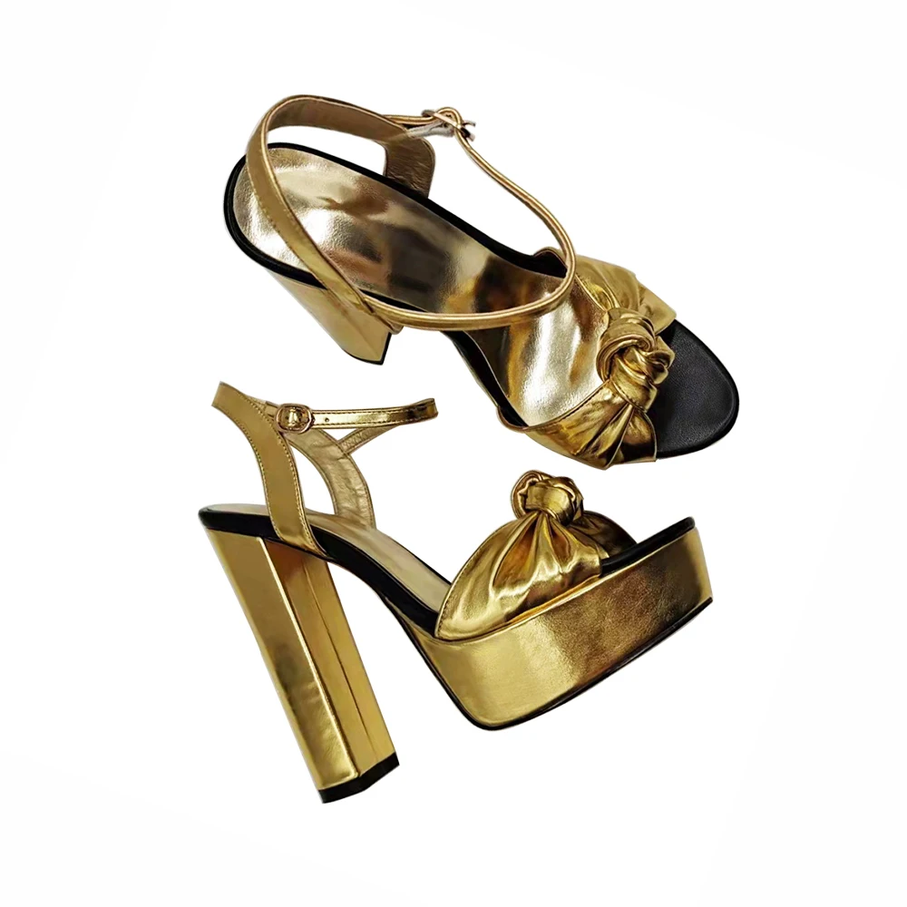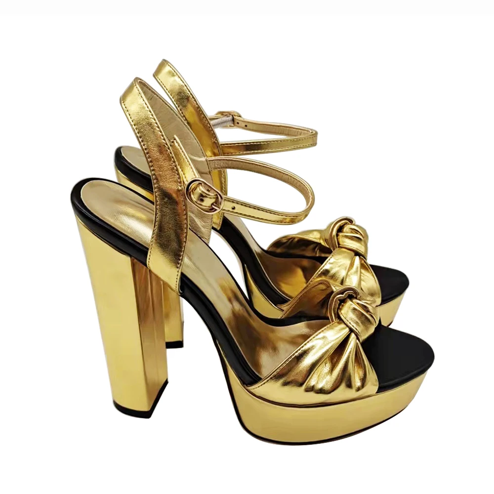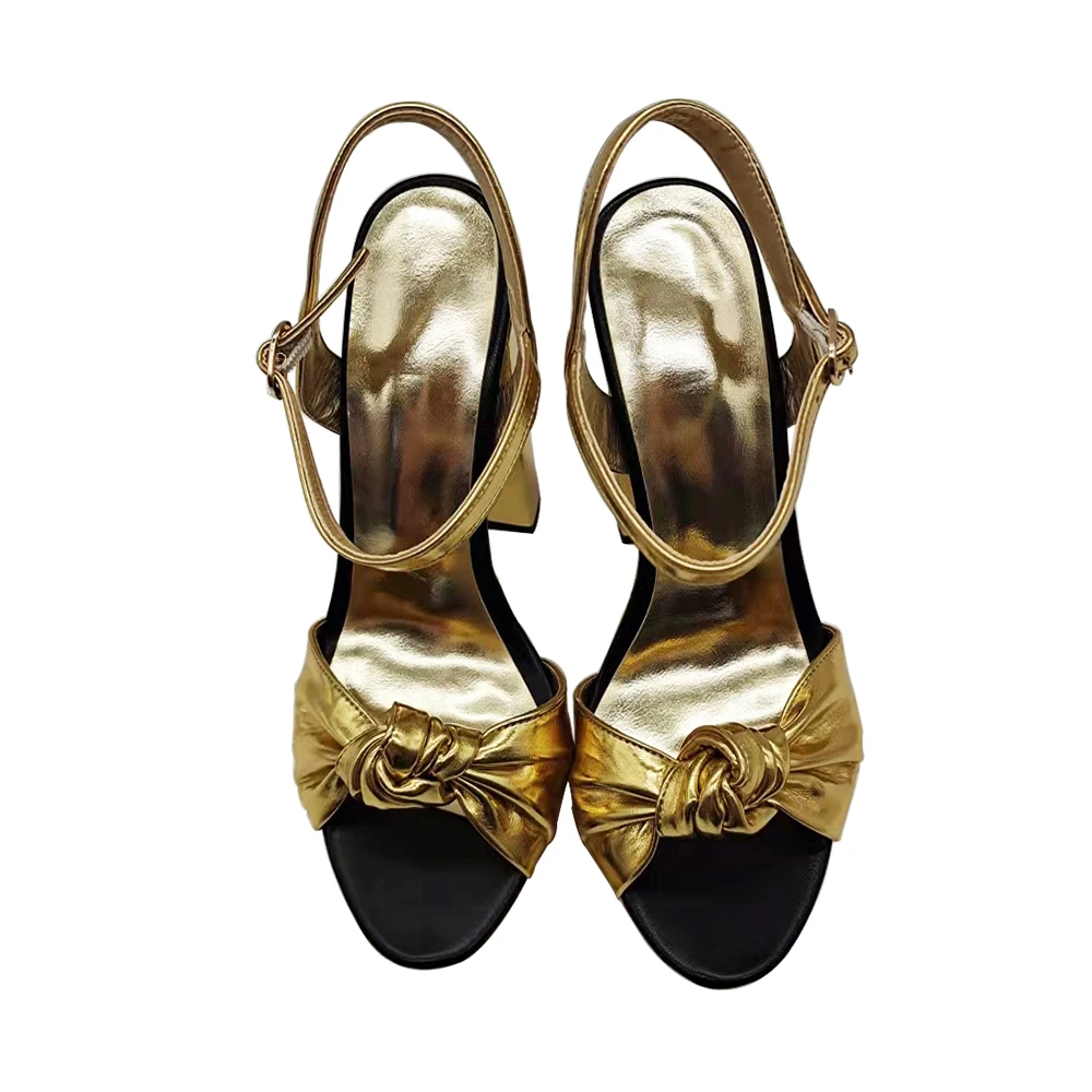Knotted Block Heel Dress Shoe Chunky Heel Gold Sandals for Women High Heel Party Shoes