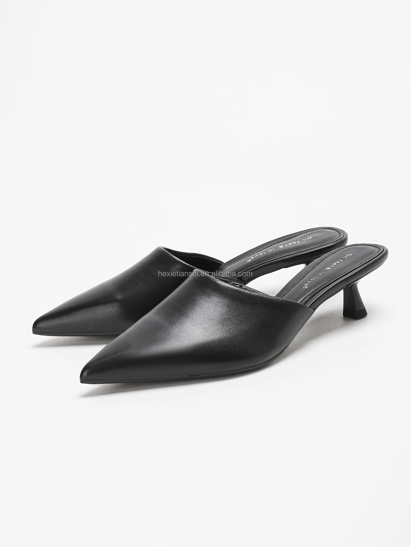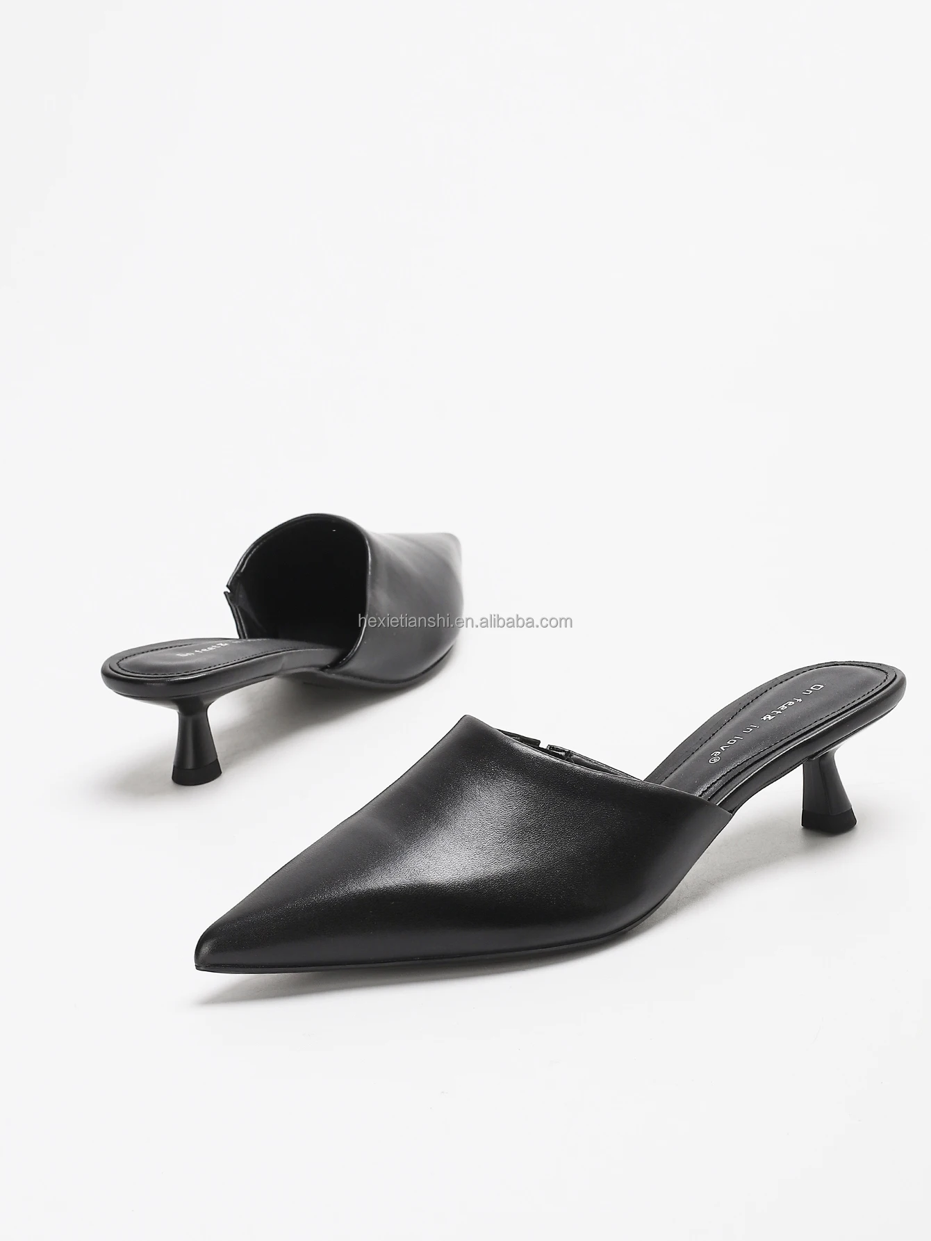1702-9 Autumn New Pointed Toe Mule Heel Shoes Simple Style Solid Black High Heeled Mule Sandals for Women