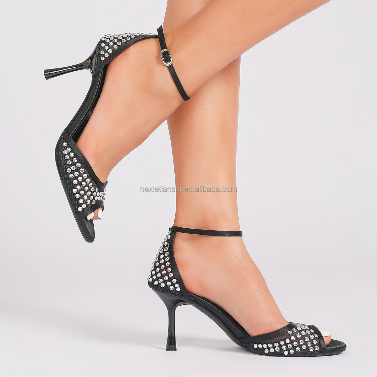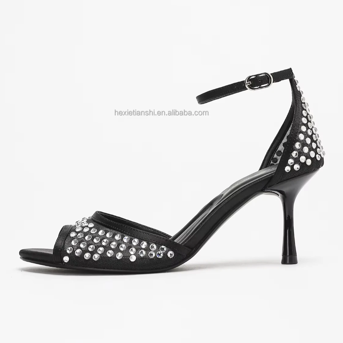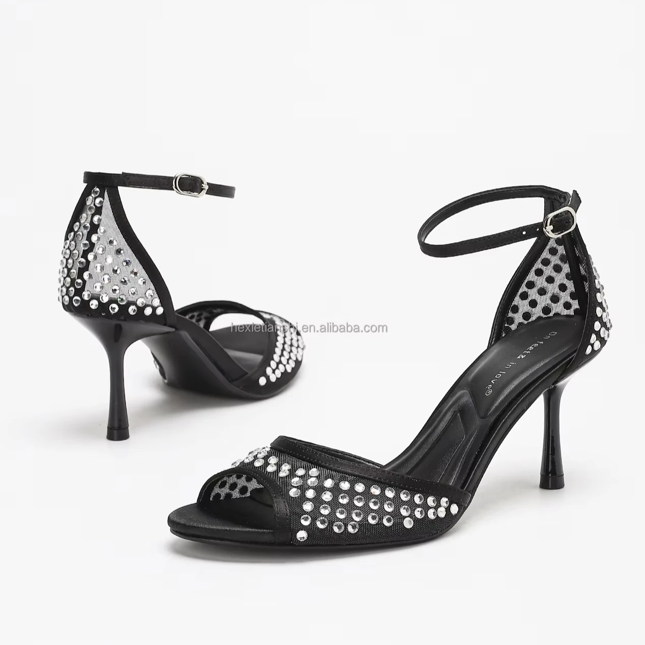 4302-9 Wholesale Custom Round Toe Fish Mouth Hollow High-heeled Sandals Open Toe Rhinestone Breathable Mesh Women Heeled Sandals