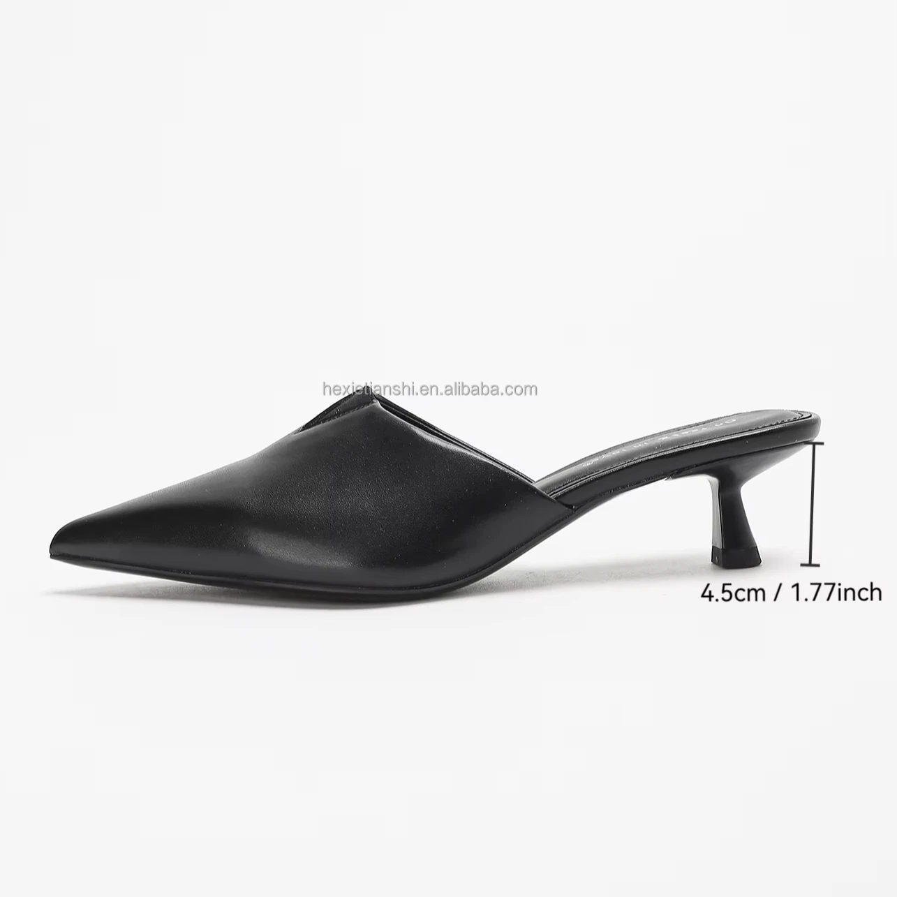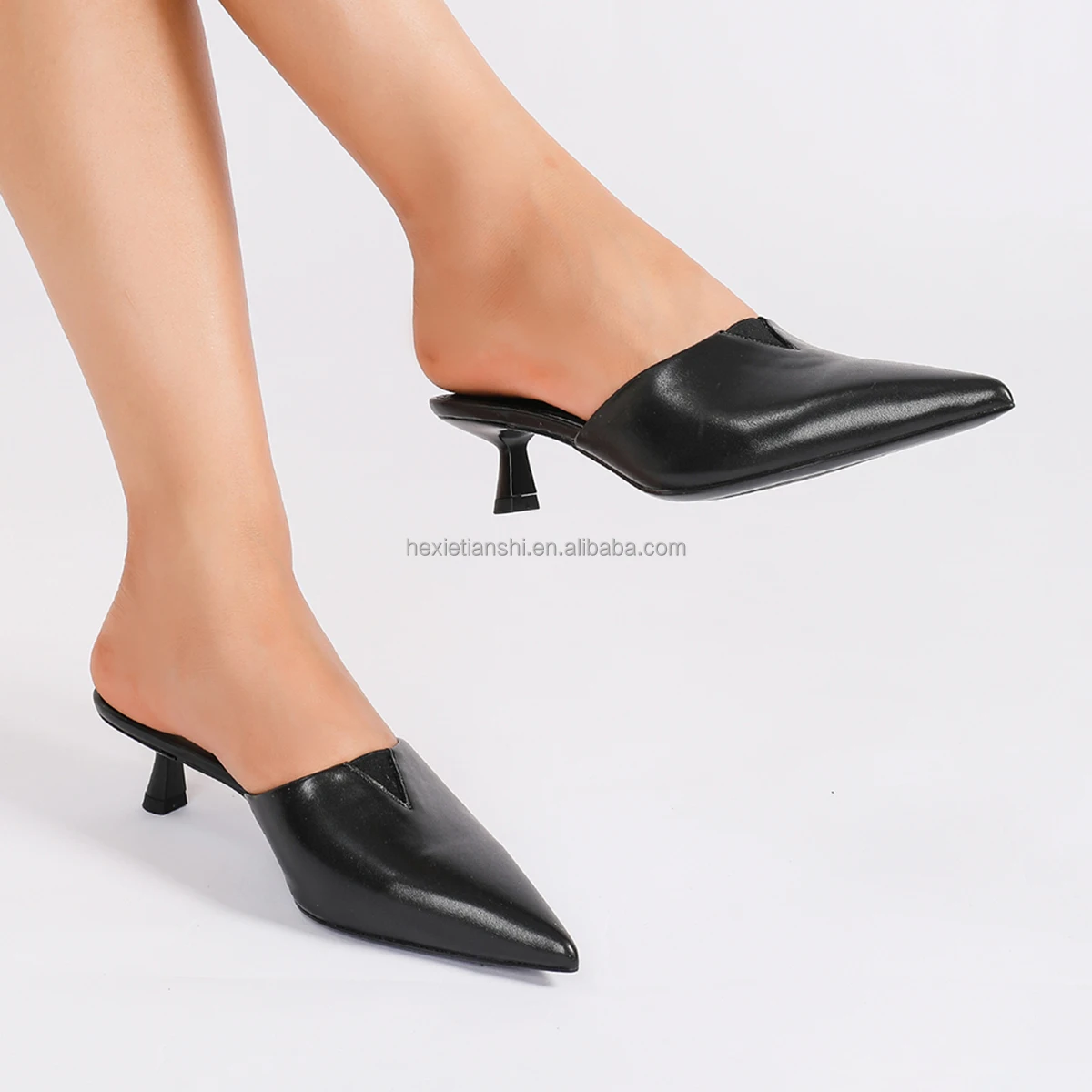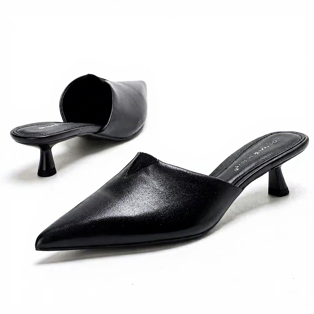 1702-10 Summer High Heeled Mule Sandals for Women Autumn New Pointed Toe Mule Heel Shoes Simple Style Black Light Weight PU
